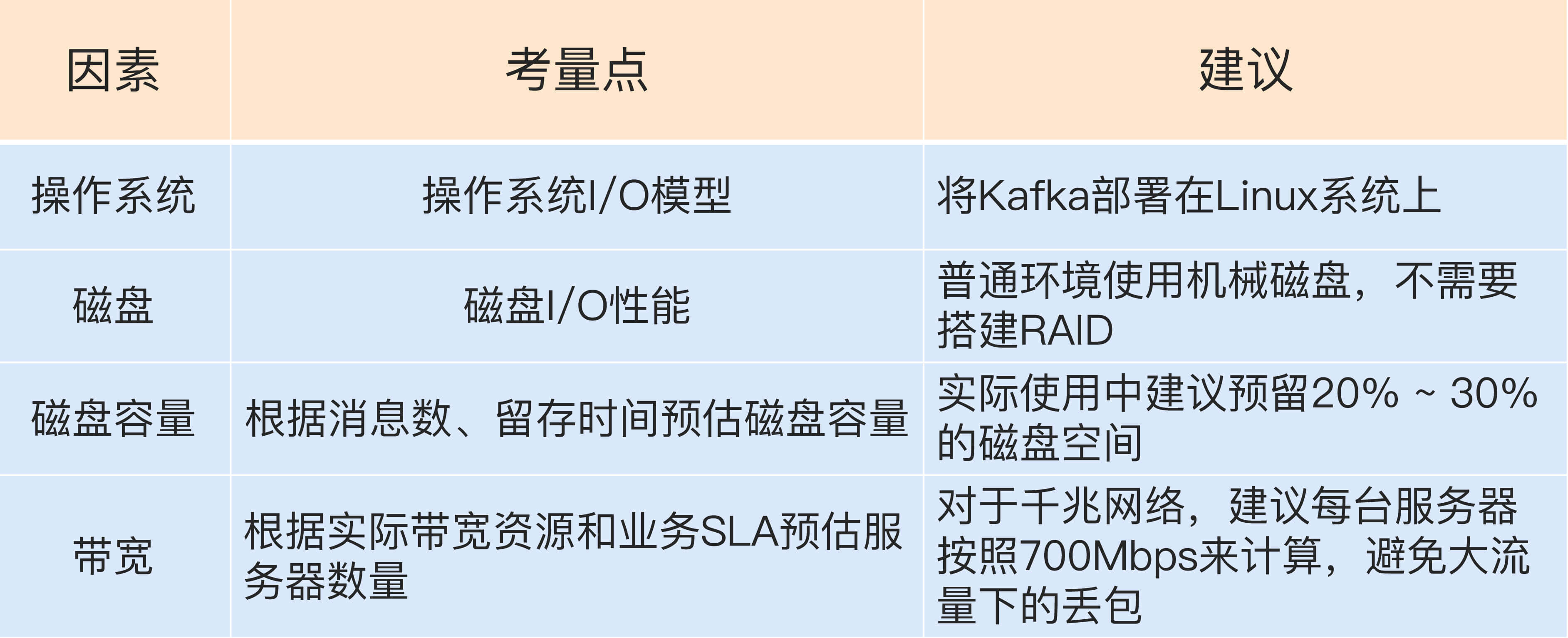 现在我们就来看看在生产环境中的Kafka集群方案该怎么做。既然是集群,那必然就要有多个Kafka节点机器,因为只有单台机器构成的Kafka伪集群只能用于日常测试之用,根本无法满足实际的线上生产需求。而真正的线上环境需要仔细地考量各种因素,结合自身的业务需求而制定。下面我就分别从操作系统、磁盘、磁盘容量和带宽等方面来讨论一下。