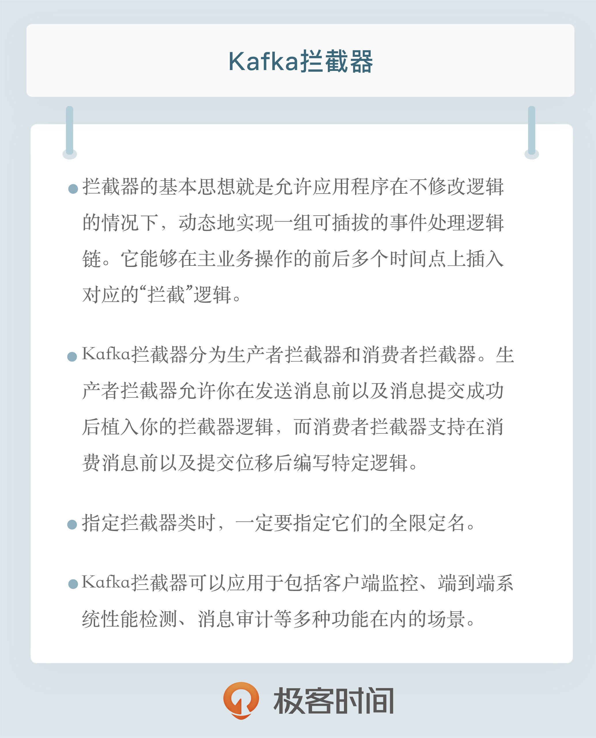 现在,通过实现拦截器的逻辑以及可插拔的机制,我们能够快速地观测、验证以及监控集群间的客户端性能指标,特别是能够从具体的消息层面上去收集这些数据。这就是Kafka拦截器的一个非常典型的使用场景。