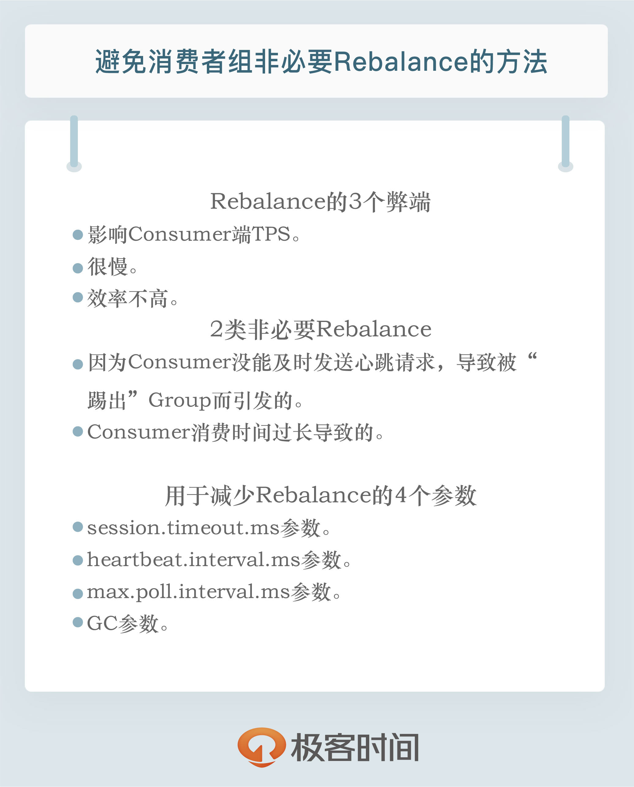 如果你按照上面的推荐数值恰当地设置了这几个参数,却发现还是出现了Rebalance,那么我建议你去排查一下Consumer端的GC表现,比如是否出现了频繁的Full GC导致的长时间停顿,从而引发了Rebalance。为什么特意说GC?那是因为在实际场景中,我见过太多因为GC设置不合理导致程序频发Full GC而引发的非预期Rebalance了。