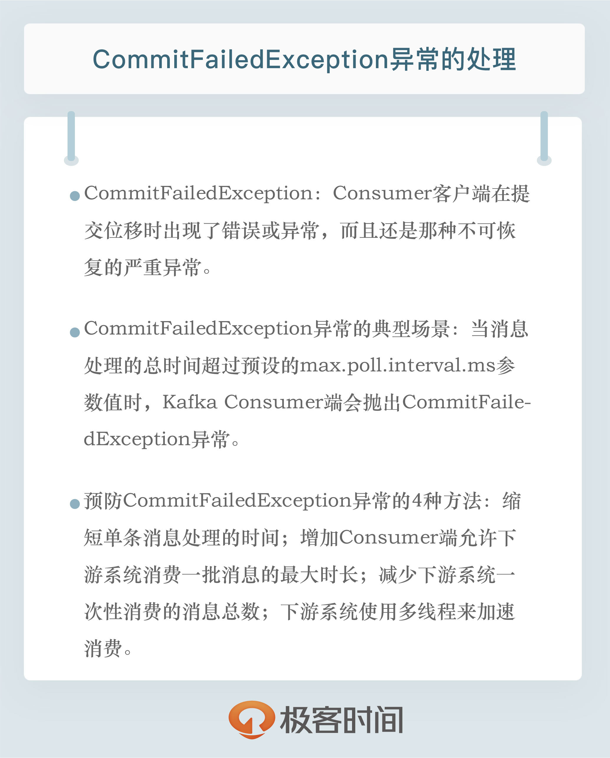 更为尴尬的是,无论是社区官网,还是网上的文章,都没有提到过这种使用场景。我个人认为,这应该算是Kafka的一个bug。比起返回CommitFailedException异常只是表明提交位移失败,更好的做法应该是,在Consumer端应用程序的某个地方,能够以日志或其他方式友善地提示你错误的原因,这样你才能正确处理甚至是预防该异常。
