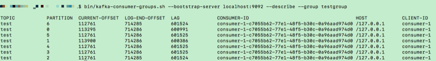 毫无疑问,在这些数据中,我们最关心的当属LAG列的值了,图中每个分区的LAG值大约都是60多万,这表明,在我的这个测试中,消费者组远远落后于生产者的进度。理想情况下,我们希望该列所有值都是0,因为这才表明我的消费者完全没有任何滞后。