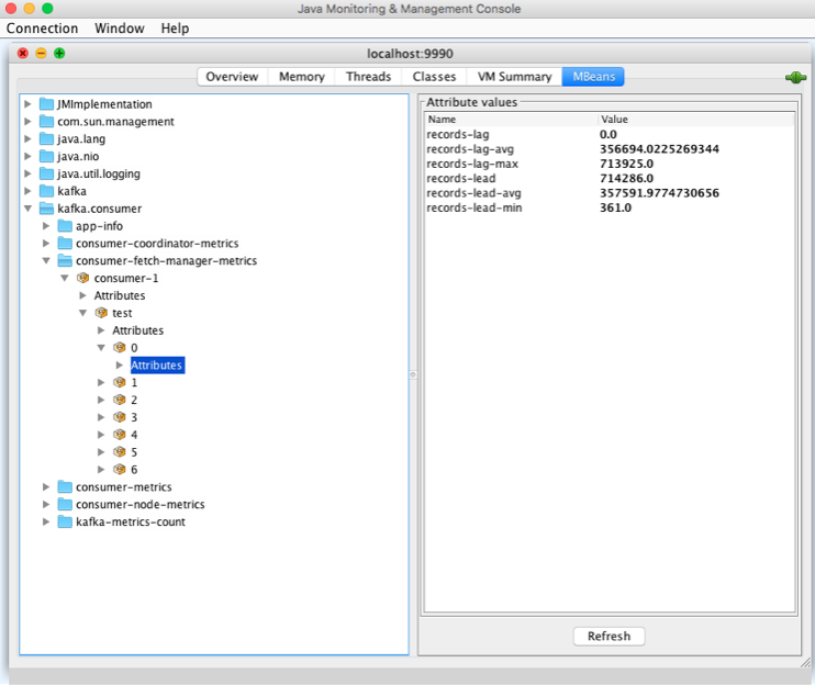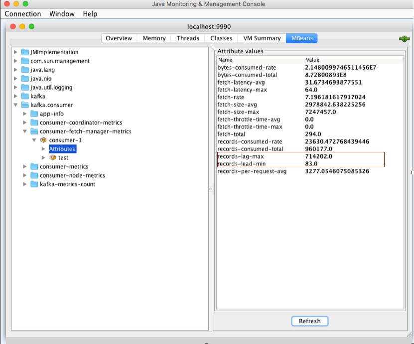 接下来,我给出一张使用JConsole工具监控此JMX指标的截图。从这张图片中,我们可以看到,client-id为consumer-1的消费者在给定的测量周期内最大的Lag值为714202,最小的Lead值是83,这说明此消费者有很大的消费滞后性。
