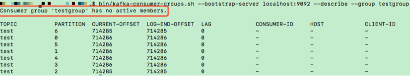 简单比较一下,我们很容易发现它和前面那张图输出的区别,即CONSUMER-ID、HOST和CLIENT-ID列没有值!如果碰到这种情况,你不用惊慌,这是因为我们运行kafka-consumer-groups脚本时没有启动消费者程序。请注意我标为橙色的文字,它显式地告诉我们,当前消费者组没有任何active成员,即没有启动任何消费者实例。虽然这些列没有值,但LAG列依然是有效的,它依然能够正确地计算出此消费者组的Lag值。
