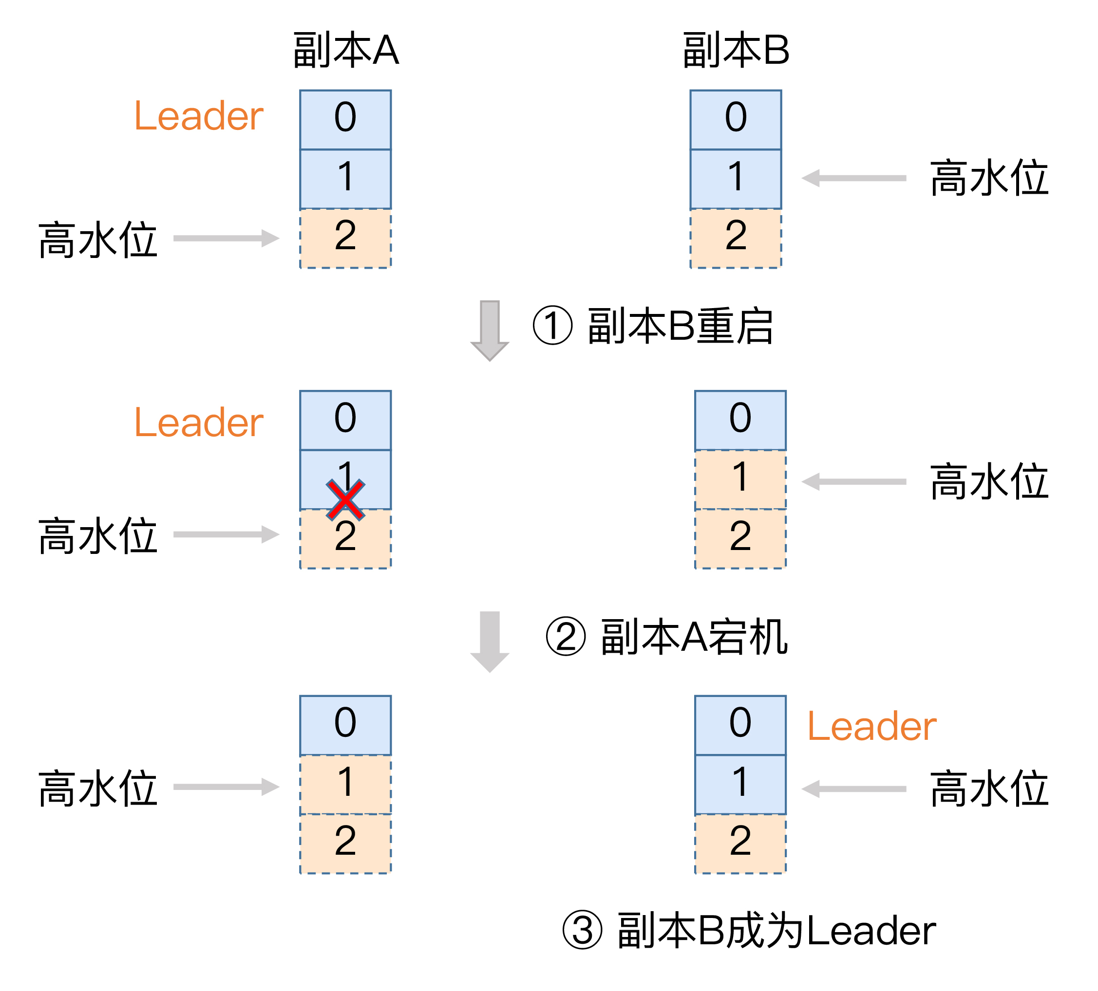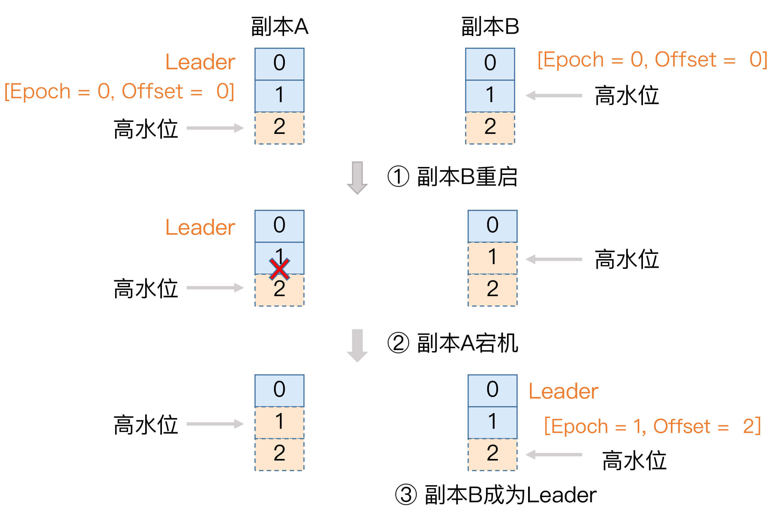 当执行完截断操作后,副本B开始从A拉取消息,执行正常的消息同步。如果就在这个节骨眼上,副本A所在的Broker宕机了,那么Kafka就别无选择,只能让副本B成为新的Leader,此时,当A回来后,需要执行相同的日志截断操作,即将高水位调整为与B相同的值,也就是1。这样操作之后,位移值为1的那条消息就从这两个副本中被永远地抹掉了。这就是这张图要展示的数据丢失场景。
