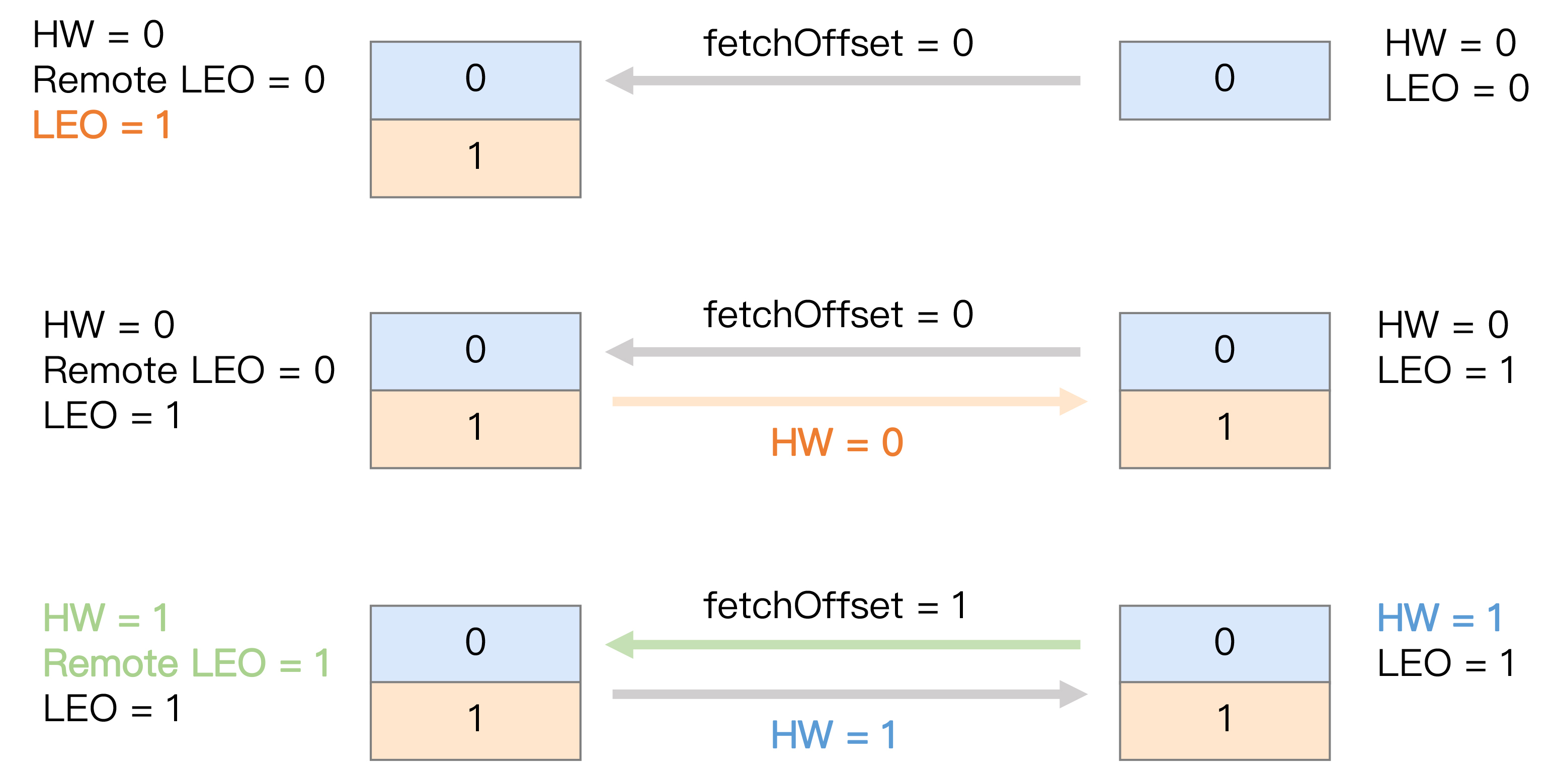 在这张图中,我们可以看到,Broker 0上保存了某分区的Leader副本和所有Follower副本的LEO值,而Broker 1上仅仅保存了该分区的某个Follower副本。Kafka把Broker 0上保存的这些Follower副本又称为远程副本(Remote Replica)。Kafka副本机制在运行过程中,会更新Broker 1上Follower副本的高水位和LEO值,同时也会更新Broker 0上Leader副本的高水位和LEO以及所有远程副本的LEO,但它不会更新远程副本的高水位值,也就是我在图中标记为灰色的部分。
