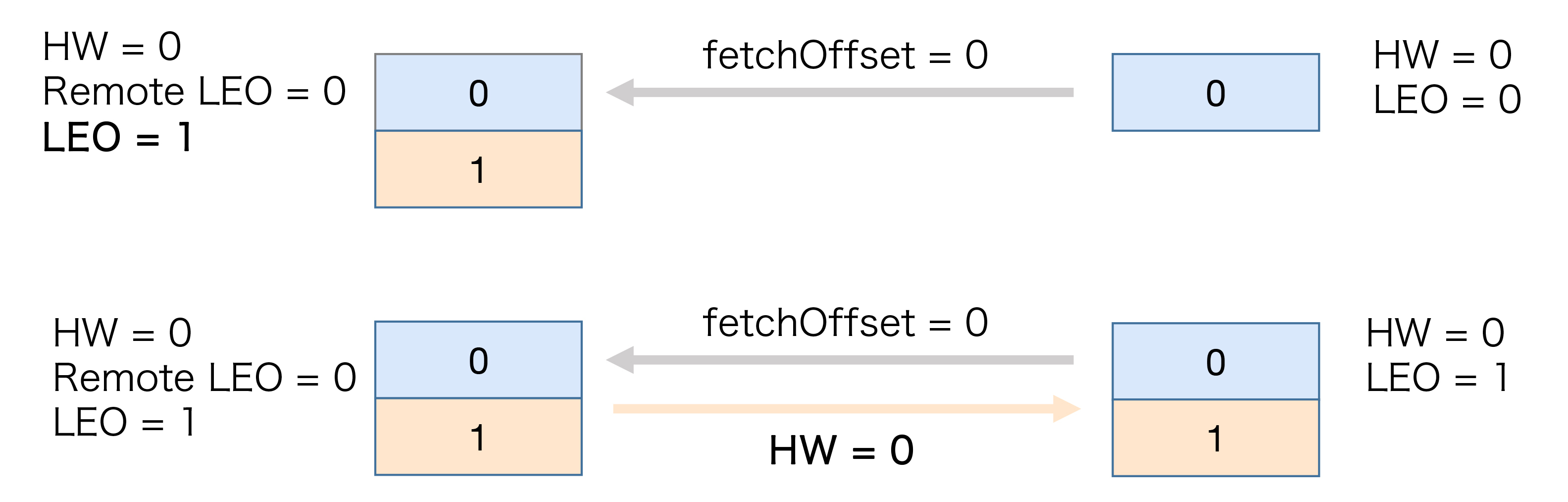 这时,Follower副本也成功地更新LEO为1。此时,Leader和Follower副本的LEO都是1,但各自的高水位依然是0,还没有被更新。它们需要在下一轮的拉取中被更新,如下图所示: