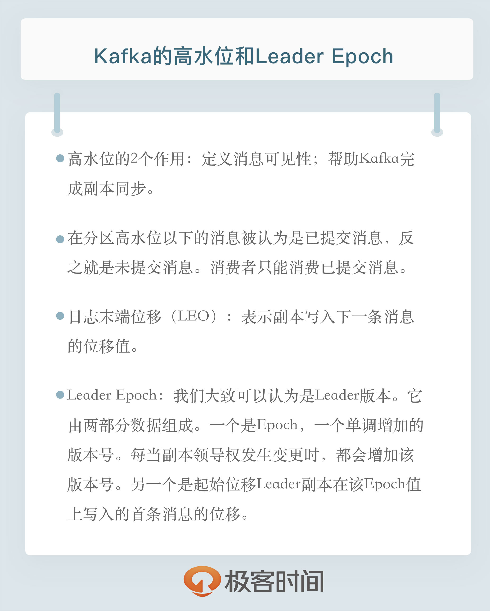 今天,我向你详细地介绍了Kafka的高水位机制以及Leader Epoch机制。高水位在界定Kafka消息对外可见性以及实现副本机制等方面起到了非常重要的作用,但其设计上的缺陷给Kafka留下了很多数据丢失或数据不一致的潜在风险。为此,社区引入了Leader Epoch机制,尝试规避掉这类风险。事实证明,它的效果不错,在0.11版本之后,关于副本数据不一致性方面的Bug的确减少了很多。如果你想深入学习Kafka的内部原理,今天的这些内容是非常值得你好好琢磨并熟练掌握的。