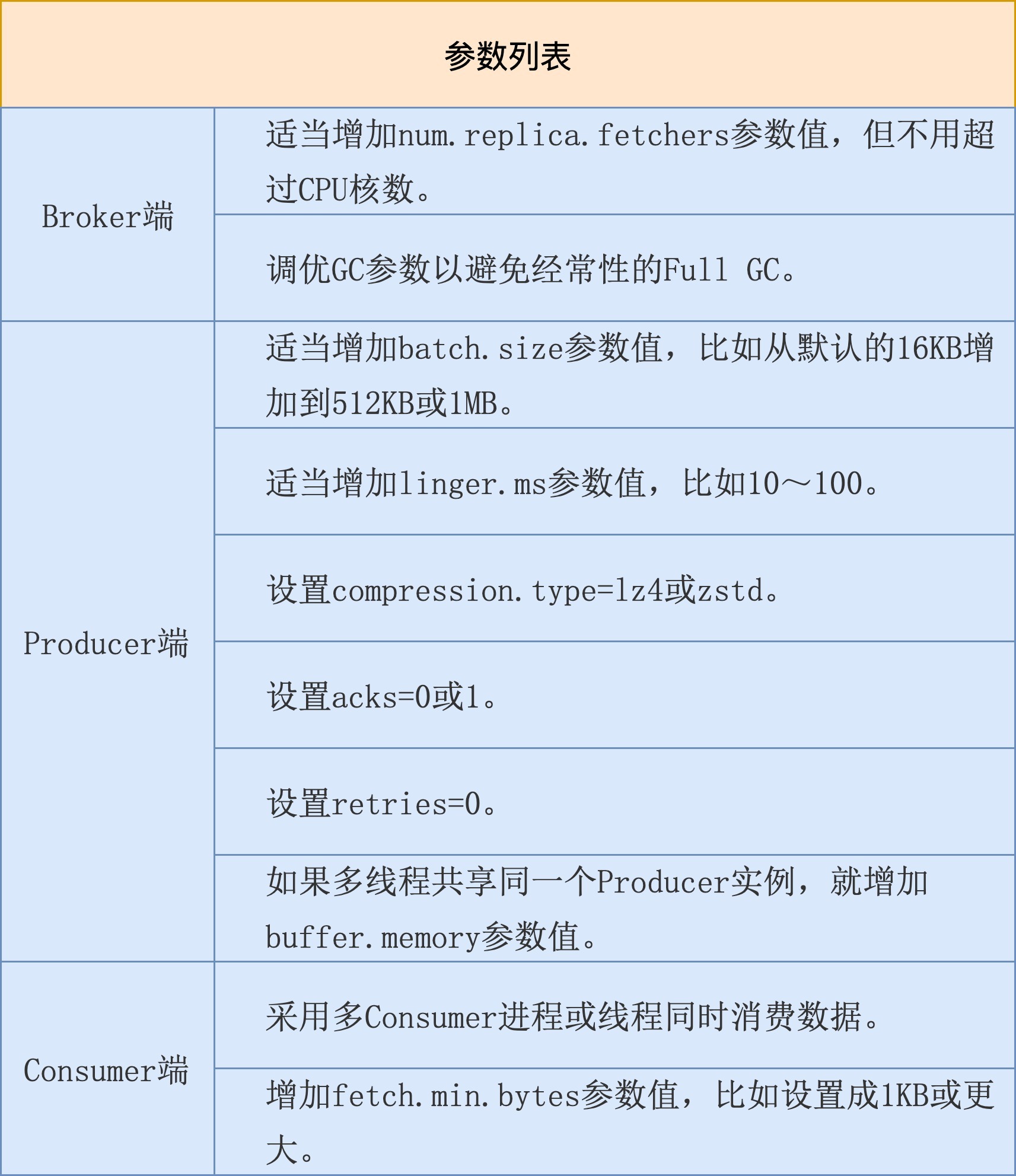 讲完了调优吞吐量,我们来说说如何优化延时,下面是调优延时的参数列表。