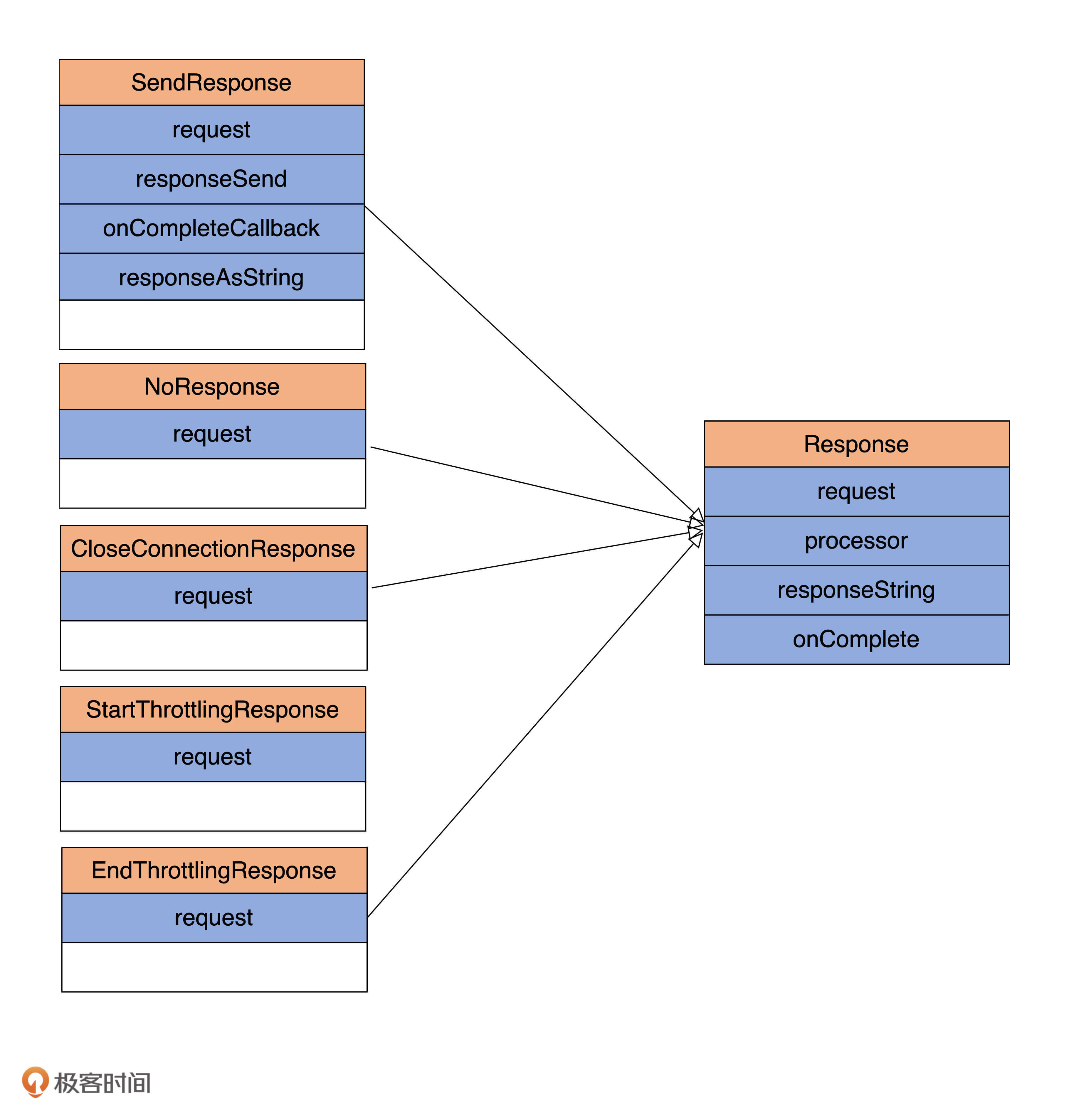 你可能又会问了:“这么多类,我都要掌握吗?”其实是不用的。你只要了解SendResponse表示正常需要发送Response,而NoResponse表示无需发送Response就可以了。至于CloseConnectionResponse,它是用于标识关闭连接通道的Response。而后面两个Response类不是很常用,它们仅仅在对Socket连接进行限流时,才会派上用场,这里我就不具体展开讲了。