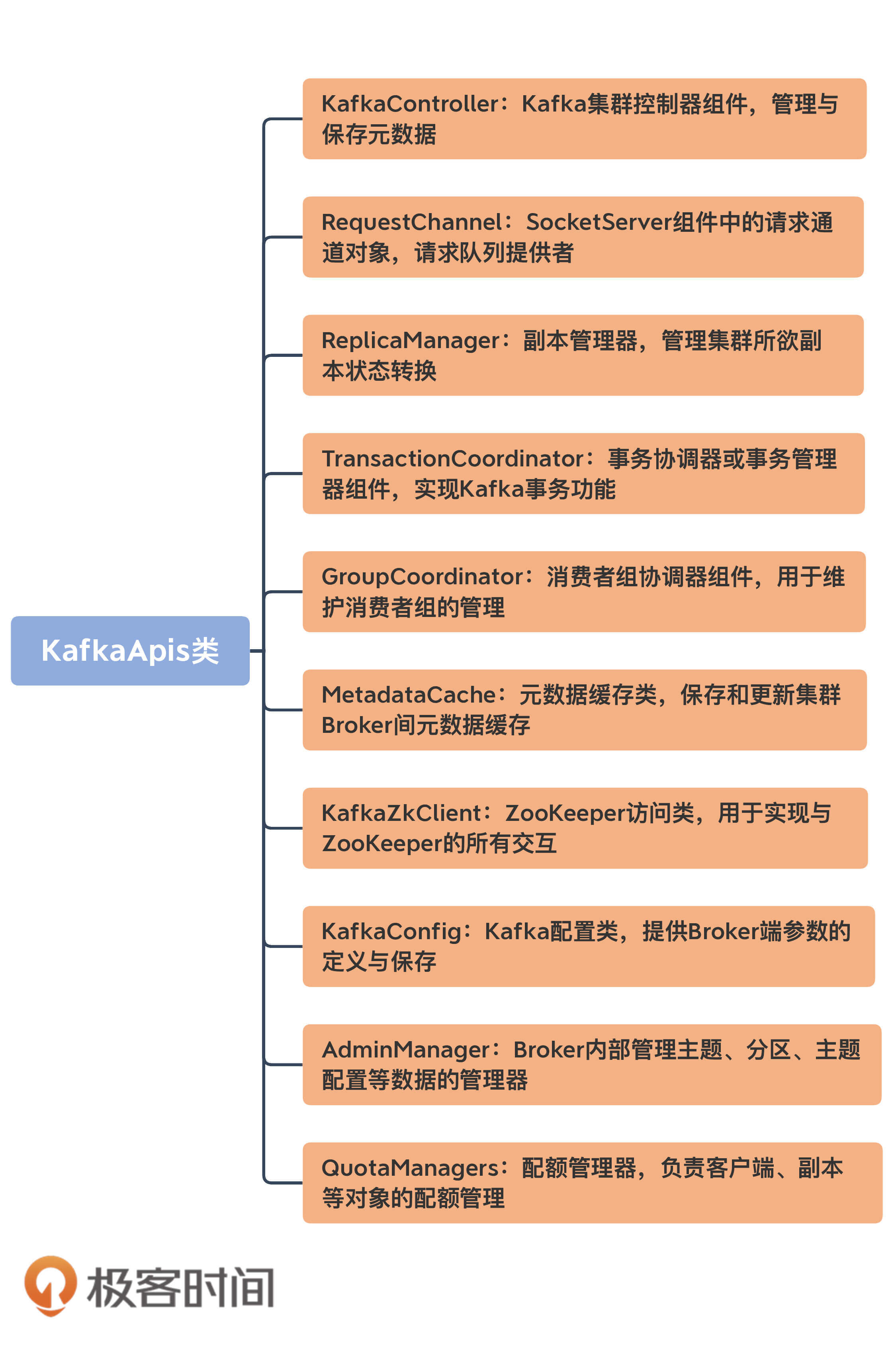 我说KafkaApis是入口类的另一个原因也在于此。你完全可以打开KafkaApis.scala文件,然后根据它的定义一个一个地去研习这些重量级组件的实现原理。等你对这些组件的代码了然于胸了,说不定下一个写源码课的人就是你了。