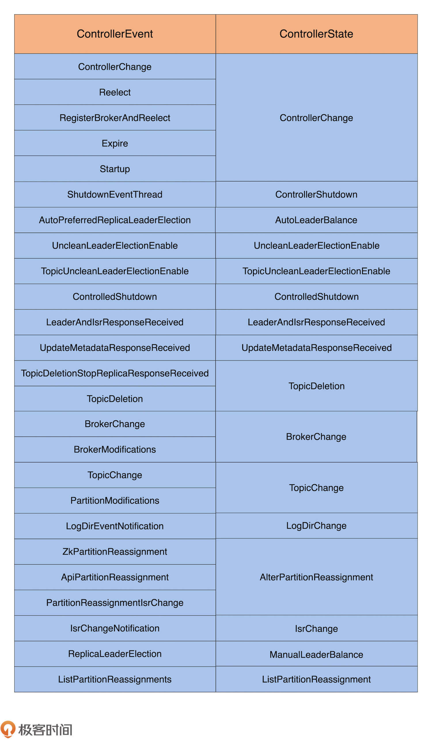 比如,TopicChange和PartitionModifications事件都属于TopicChange状态,毕竟,它们都与Topic的变更有关。前者是创建Topic,后者是修改Topic的属性,比如,分区数或副本因子,等等。