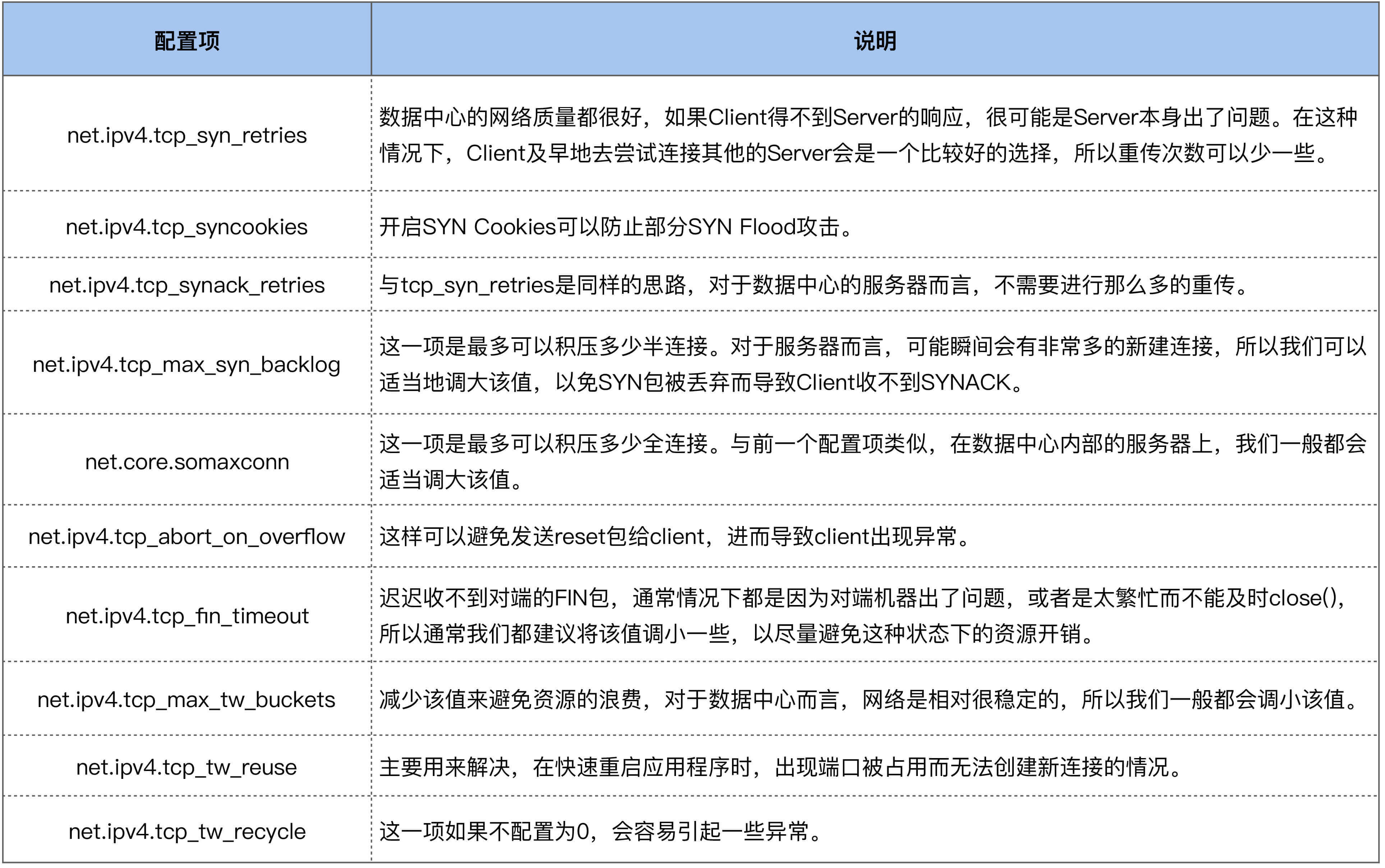 当然了,有些配置项也是可以根据你的服务器负载以及CPU和内存大小来做灵活配置的,比如tcp_max_syn_backlog、somaxconn、tcp_max_tw_buckets这三项,如果你的物理内存足够大、CPU核数足够多,你可以适当地增大这些值,这些往往都是一些经验值。