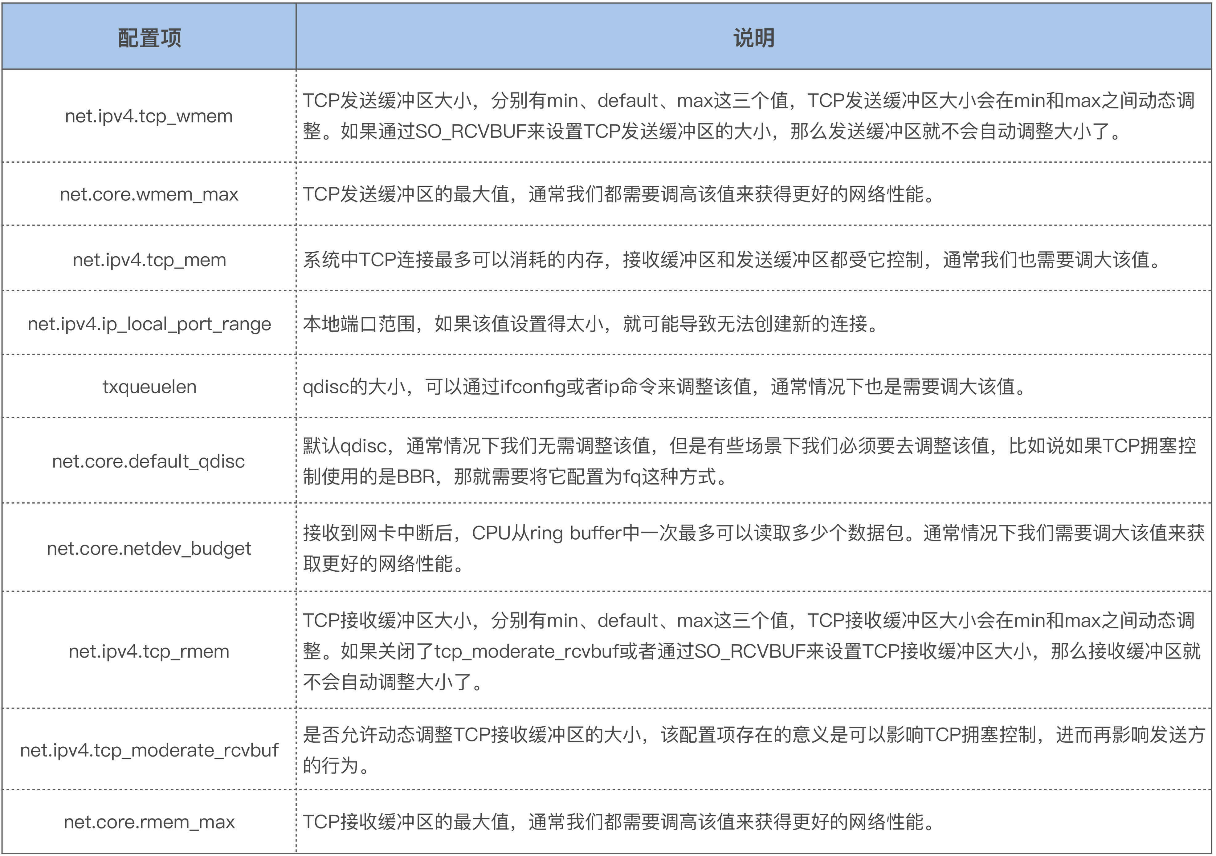 好了,这节课就讲到这里,我们简单回顾一下。TCP/IP是一个很复杂的协议栈,它的数据包收发过程也是很复杂的,我们这节课只是重点围绕这个过程中最容易引发问题的地方来讲述的。我们刚才提到的那些配置选项都很容易在生产环境中引发问题,并且也是我们针对高性能网络进行调优时必须要去考虑的。我把这些配置项也总结为了一个表格,方便你来查看: