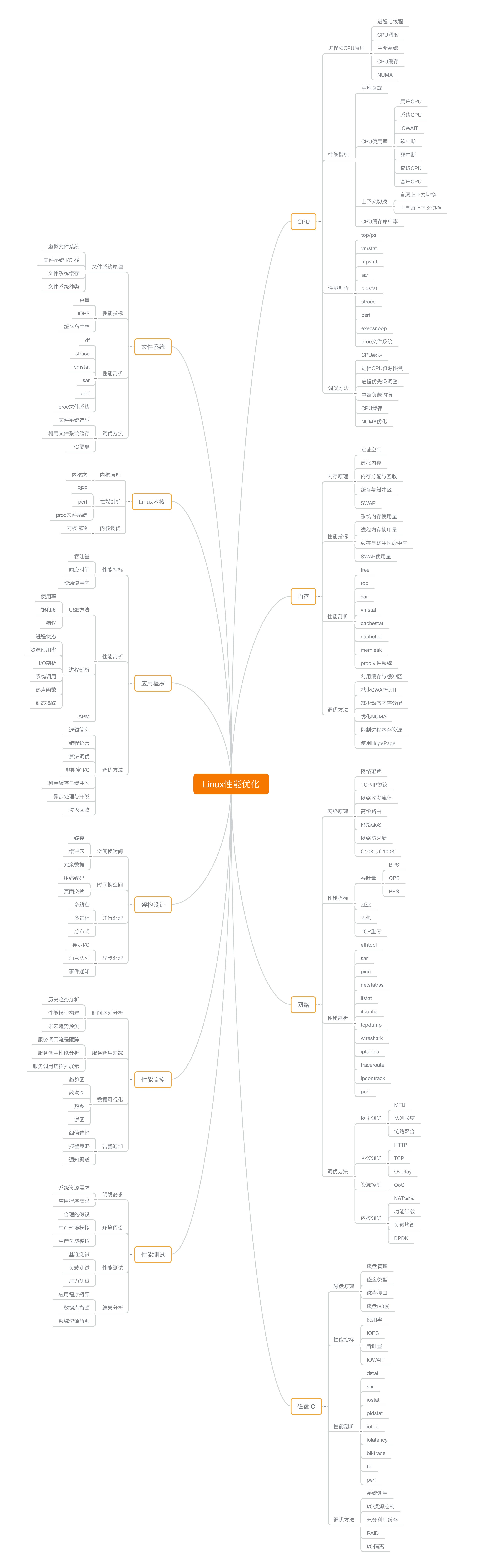 最后,为了让你对性能有个全面的认识,我画了一张思维导图,里面涵盖了大部分性能分析和优化都会包含的知识,专栏中也基本都会讲到。你可以保存或者打印下来,每学会一部分就标记出来,记录并把握自己的学习进度。