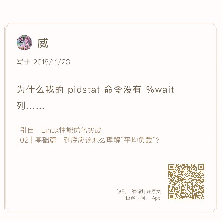 在这里顺便提一下,留言中很常见的一个错误。有些同学会拿 pidstat 中的 %wait 跟 top 中的 iowait% (缩写为wa)对比,其实这是没有意义的,因为它们是完全不相关的两个指标。