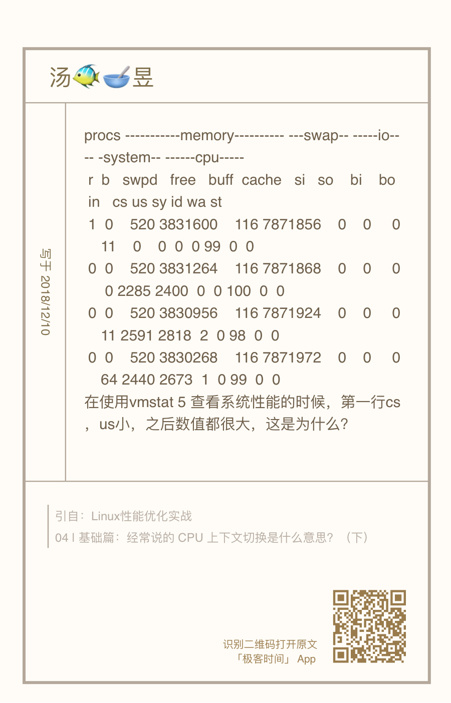这个问题主要是说,在执行 vmstat 时,第一行数据跟其他行相比较,数值相差特别大。我相信不少同学都注意到了这个现象,这里我简单解释一下。