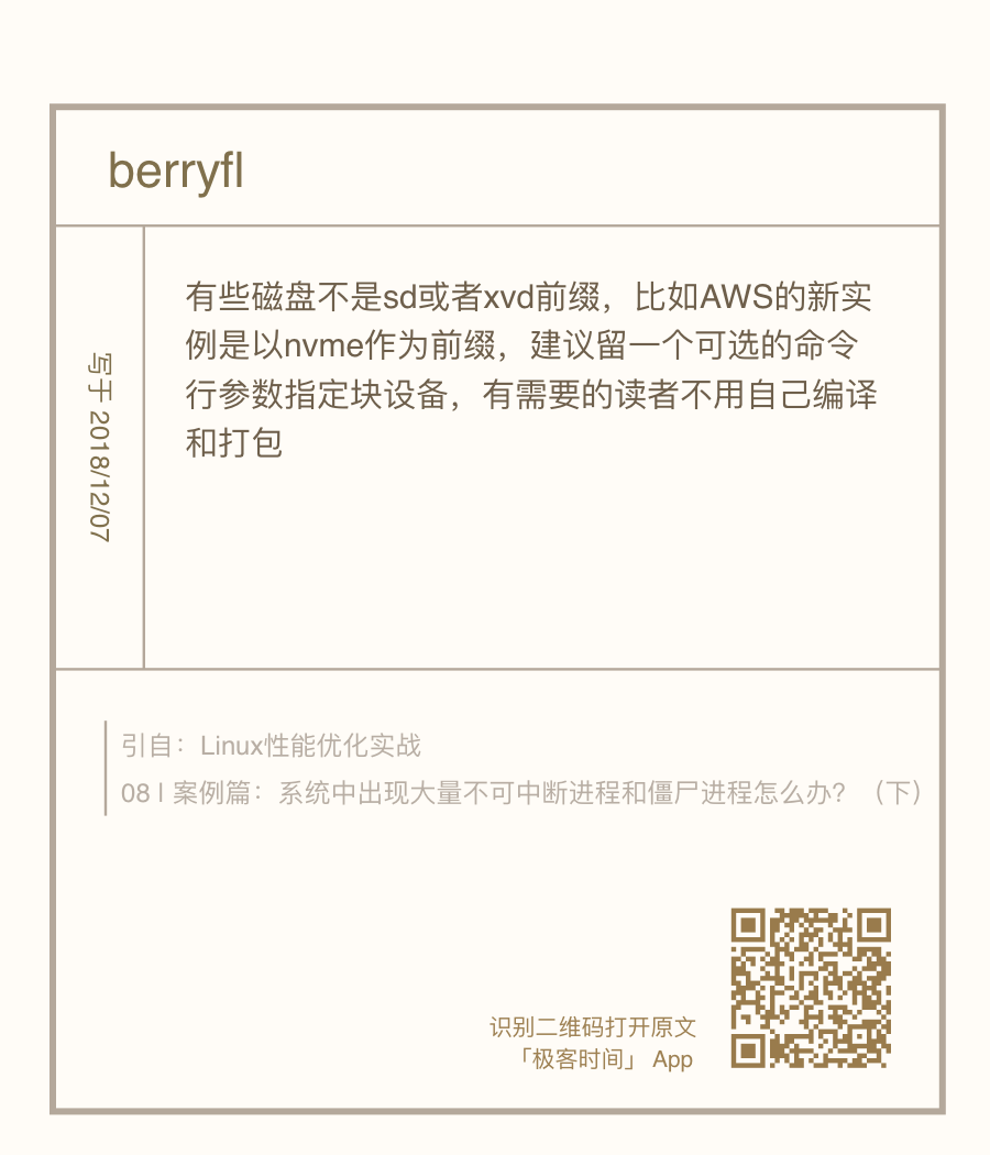 另外,由于我在案例中只查找了 /dev/xvd 和 /dev/sd 前缀的磁盘,而没有考虑到使用其他前缀磁盘(比如 /dev/nvme)的同学。如果你正好用的是其他前缀,你可能会碰到跟Vicky 类似的问题,也就是app 启动后又很快退出,变成 exited 状态。