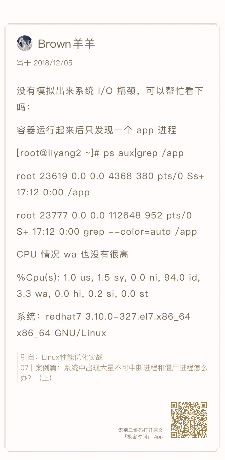 今天是性能优化答疑的第一期。为了便于你学习理解,它们并不是严格按照文章顺序排列的。每个问题,我都附上了留言区提问的截屏。如果你需要回顾内容原文,可以扫描每个问题右下方的二维码查看。