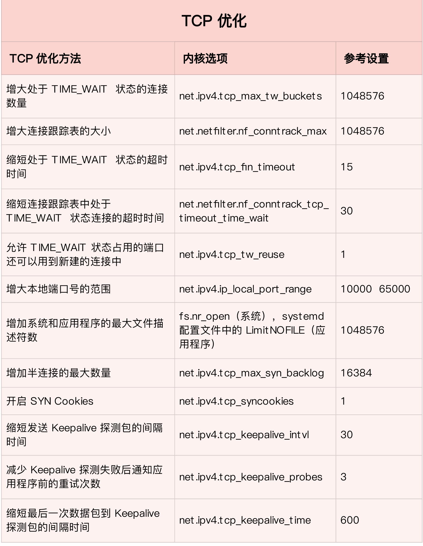 讲了这么多TCP 优化方法,我也把它们整理成了一个表格,方便你在需要时参考(数值仅供参考,具体配置还要结合你的实际场景来调整):