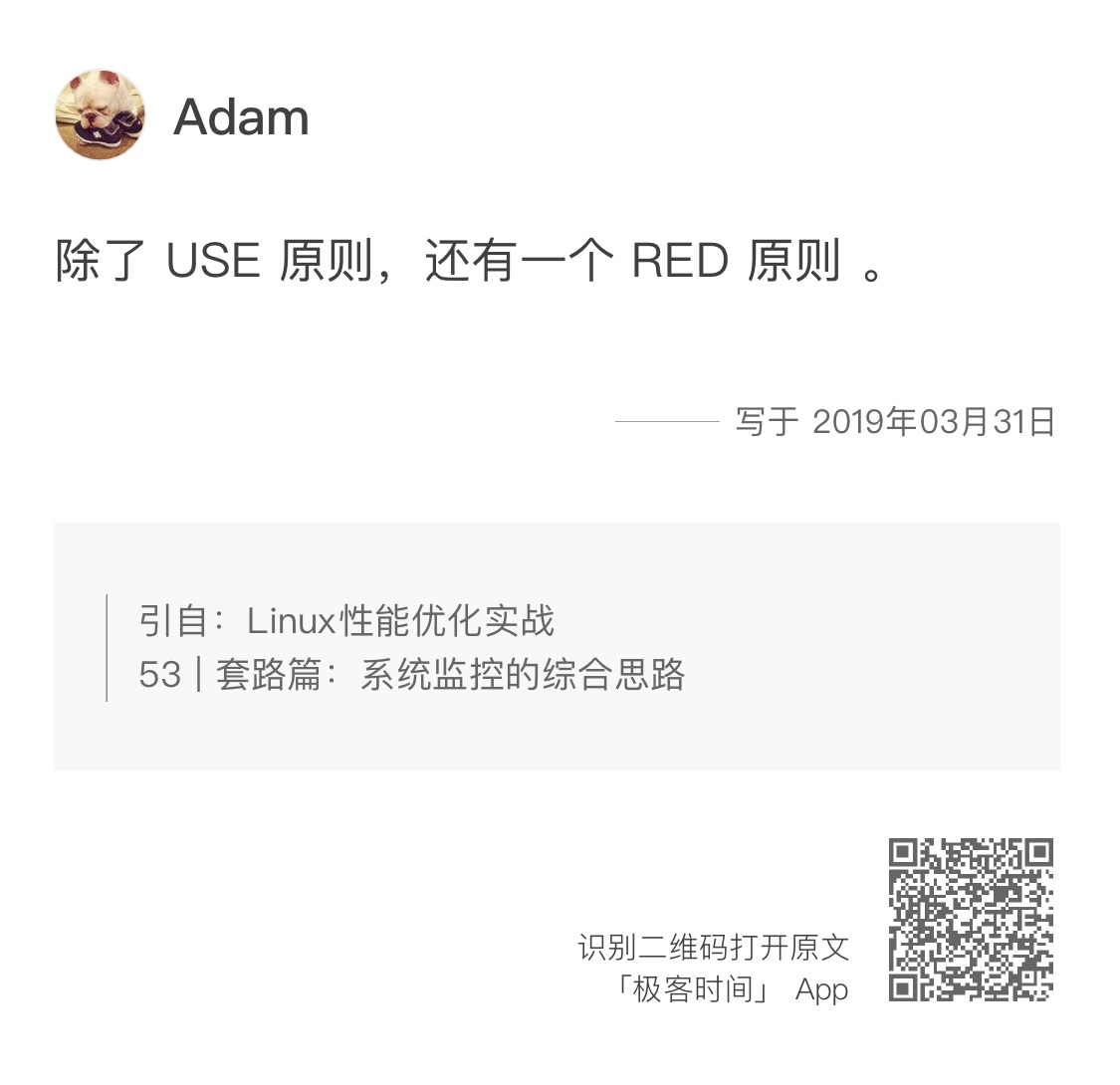 不过,对应用程序的监控来说,这些指标显然就不合适了。因为应用程序的核心指标,是请求数、错误数和响应时间。那该怎么办呢?这其实,正是 Adam 同学在留言中提到的 RED 方法。
