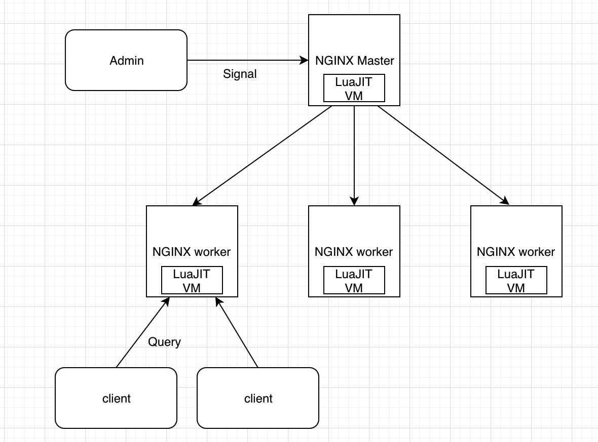 前面我们提到过,OpenResty 的 worker 进程都是 fork master 进程而得到的, 其实, master 进程中的 LuaJIT 虚拟机也会一起 fork 过来。在同一个 worker 内的所有协程,都会共享这个 LuaJIT 虚拟机,Lua 代码的执行也是在这个虚拟机中完成的。