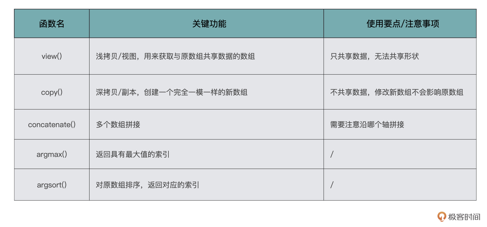 让我们一起来复习一下今天学到的这些函数,我画了一张表格,给你总结了它们各自的关键功能和使用要点。