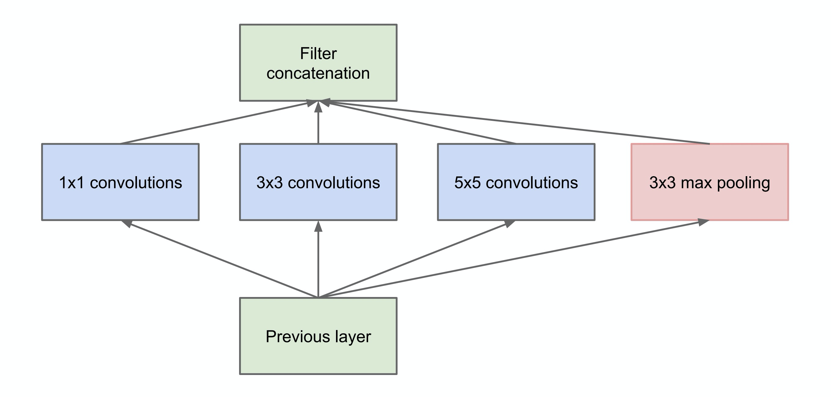 但是正如上图所示,很可能物体以不同的尺寸出现在图片中,那么能否以不同尺度的卷积来提取不同的特征呢?沿着这个想法,Inception模块应运而生,如下图示: