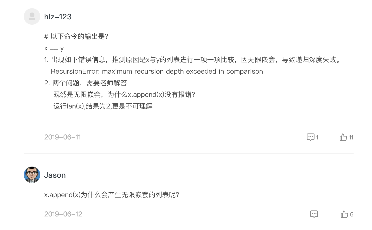 不过,虽然x是无限嵌套的列表,但x.append(x)的操作,并不会递归遍历其中的每一个元素。它只是扩充了原列表的第二个元素,并将其指向x,因此不会出现stack overflow的问题,自然不会报错。
