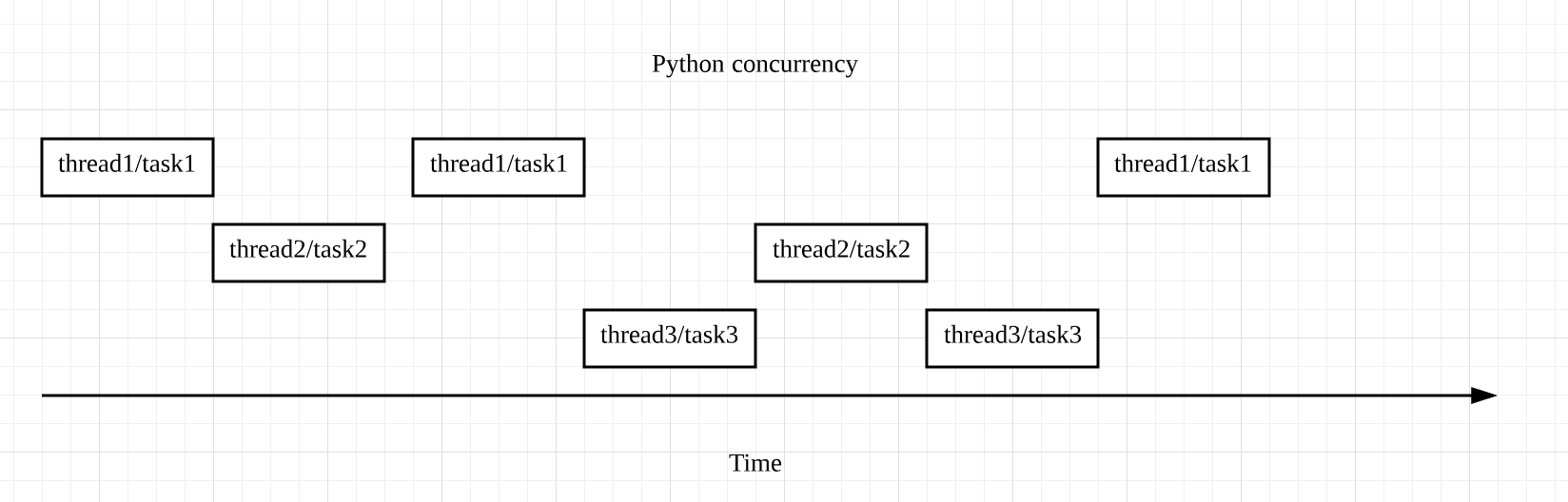 其实,GIL的存在与Python支持多线程并不矛盾。前面我们讲过,GIL是指同一时刻,程序只能有一个线程运行;而Python中的多线程,是指多个线程交替执行,造成一个“伪并行”的结果,但是具体到某一时刻,仍然只有1个线程在运行,并不是真正的多线程并行。这个机制,我画了下面这张图来表示: