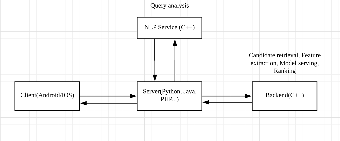 你可以看到,大概的工作流程是:用户在客户端(client)输入一个查询(query),发送请求(request)到达服务器端(server-side);服务器端首先向NLP service发请求,并对请求进行分析,等到拿到各项信号(signal)后,再向后端(backend)发送请求;后端会做特征抽取(feature extraction),利用ML 模型进行结果的检索(candidate retrieval)、排序,最后再把结果返回给服务器端和客户端。