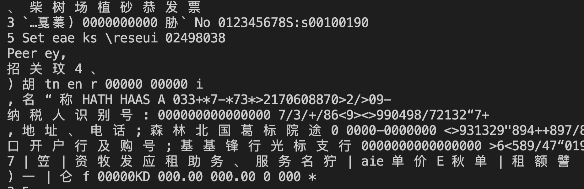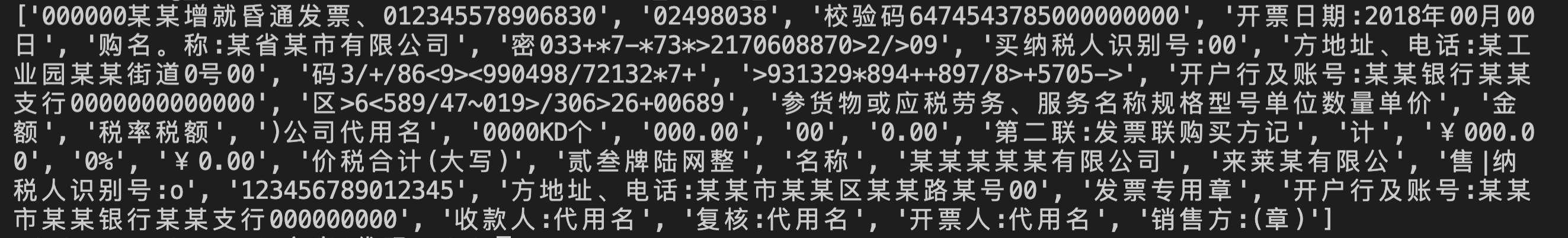 在这段代码里,实现了三个功能,分别是用户验证、读取图片和识别图片。为了让你更直观地看到效果,我来对一张电子发票的图片example.png进行识别。识别结果如下: