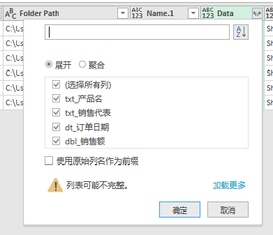 Data列保存了我们在第二步选中的sheet的所有表格,在我们今天的案例中,由于我需要所有的列,因此我就“选择所有列”,并点击“确定”按钮,展开Data列,这样就得到了我需要查询的数据。