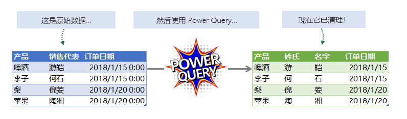 具体做法是:你可以在存放半年销售数据的文件夹中,直接放入下一个月的销售数据。只要原始的Excel文件格式和之前的6个文件相同,那么当你点击“刷新”按钮后,Power Query就会自动加载新的Excel文件,并自动把新的数据中的姓名、日期进行拆分。