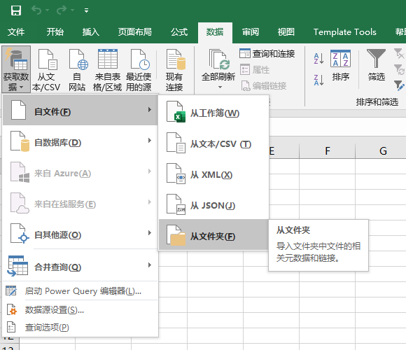 获取数据,指的是把数据传入Power Query 的过程。通常我们会新建一个工作簿,把Excel打开之后,然后再切换到“数据”选项卡。接着,单击“获取数据”按钮,在下拉菜单中选择“自文件”命令,继续在下一级菜单中选择“从文件夹”命令,通过弹出的“文件夹”对话框,就可以加载文件夹中的所有Excel文件了。具体操作示范如下图。