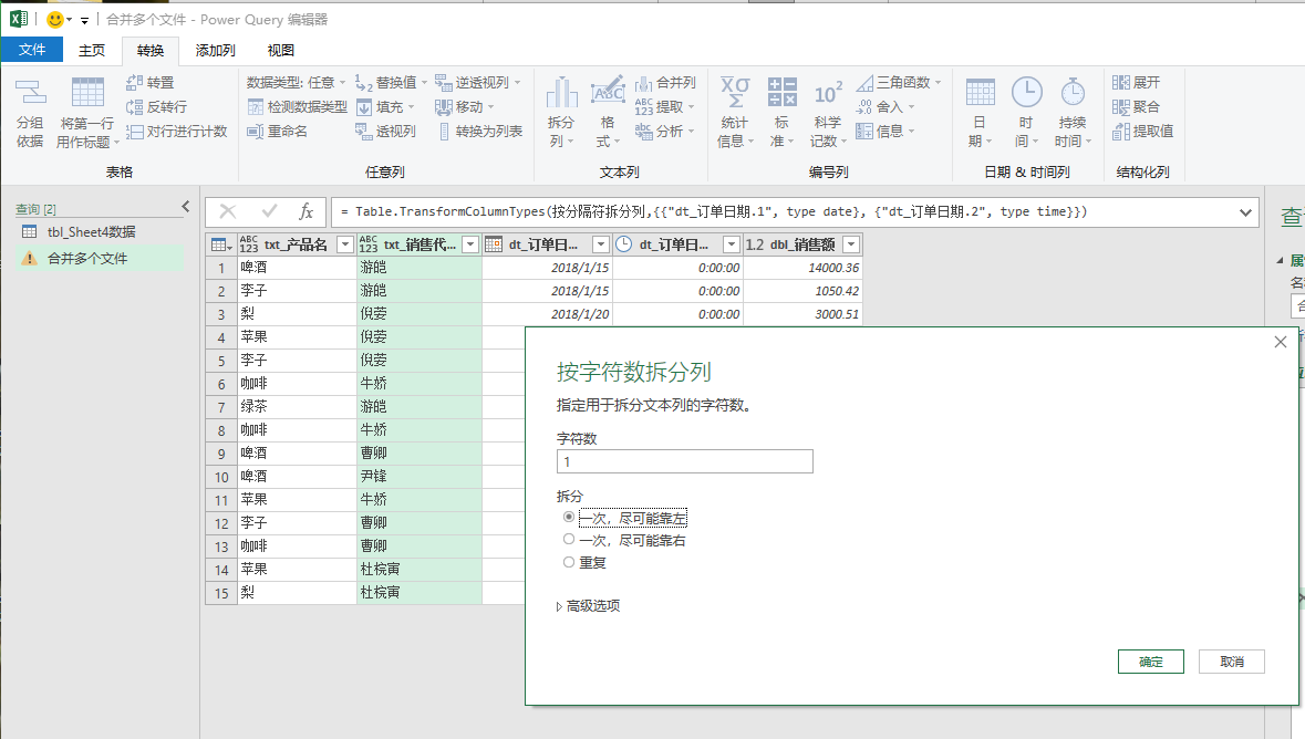 这里我也再补充一点,除了“按分隔符拆分”外,你还可以按字的个数进行拆分。例如,我把销售代表的“姓名”进行拆分,你可以使用“按字符数拆分列”选项,如下图: