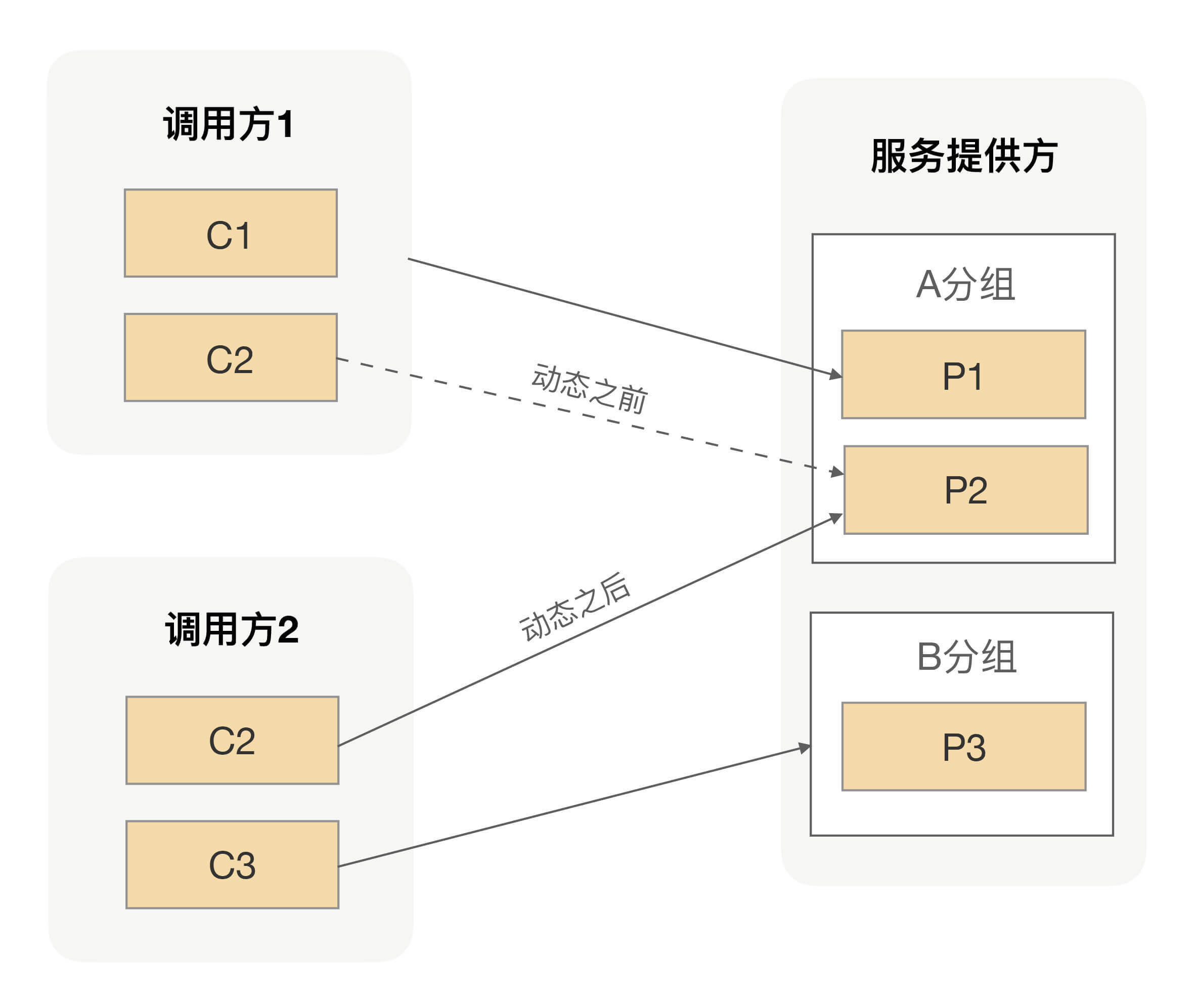 举个例子,服务提供方有3个服务实例,其中A分组有2个实例,B分组有1个实例,调用方1调用A分组,调用方2调用B分组。我们把A分组里面的一个实例分组在注册中心由A分组改为B分组,经过服务发现影响后,整个调用拓扑就变成了这样: