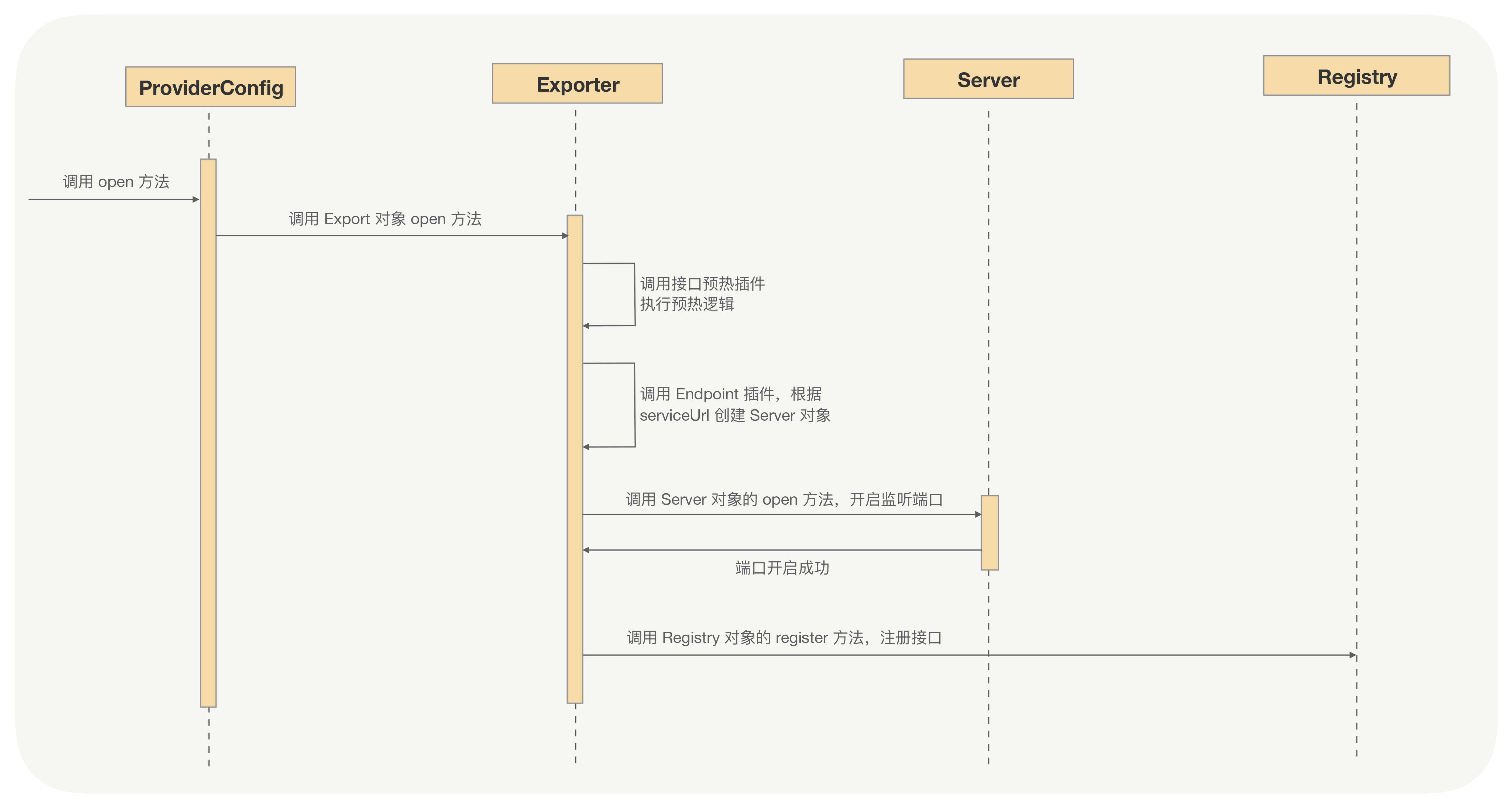 创建完服务端的Exporter对象之后,我们就要开启Exporter对象,开启Exporter对象最重要的两个操作就是开启传输层中Server的端口,用来接收调用端发送过来的请求,以及将服务端节点注册到注册中心上,让调用端可以发现到这个服务节点,整个流程如下: