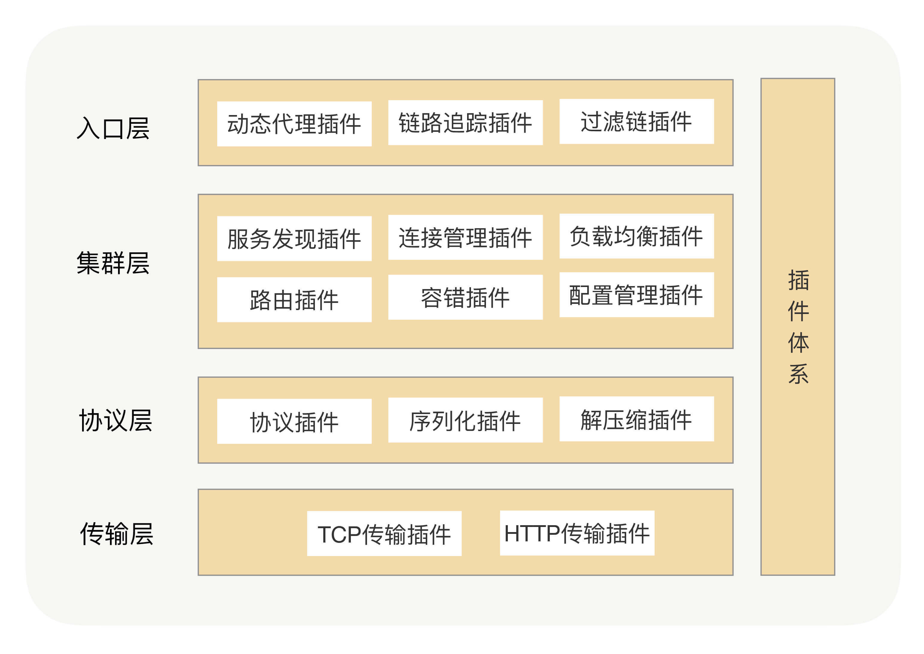 首先说我们RPC框架的整体架构,这里请你回想下[第 07 讲],在这一讲中我讲解了如何设计一个灵活的RPC框架,其关键点就是插件化,我们可以利用插件体系来提高RPC的扩展性,使其成为一个微内核架构,如下图所示: