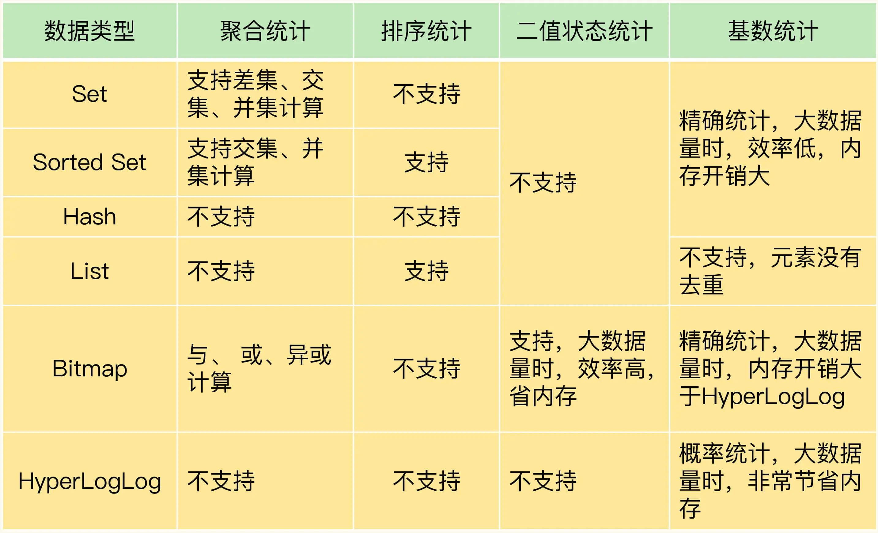 这节课,我们结合统计新增用户数和留存用户数、最新评论列表、用户签到数以及网页独立访客量这 4 种典型场景,学习了集合类型的 4 种统计模式,分别是聚合统计、排序统计、二值状态统计和基数统计。为了方便你掌握,我把 Set、Sorted Set、Hash、List、Bitmap、HyperLogLog 的支持情况和优缺点汇总在了下面的表格里,希望你把这张表格保存下来,时不时地复习一下。