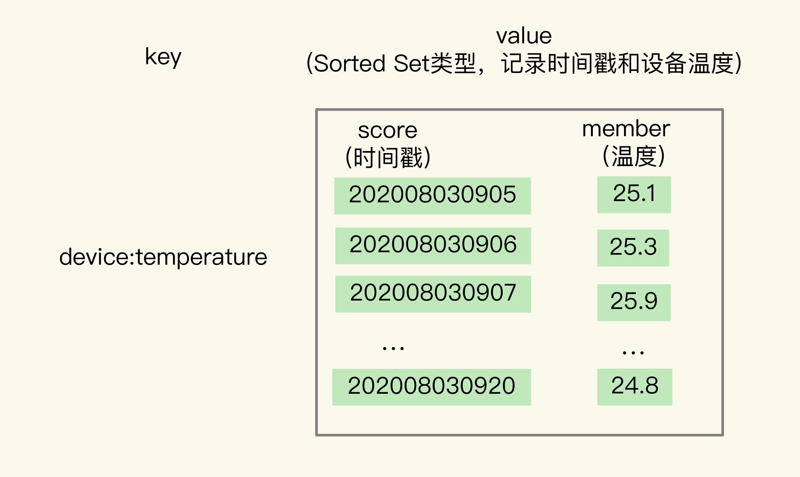 为了能同时支持按时间戳范围的查询,可以用 Sorted Set 来保存时间序列数据,因为它能够根据元素的权重分数来排序。我们可以把时间戳作为 Sorted Set 集合的元素分数,把时间点上记录的数据作为元素本身。