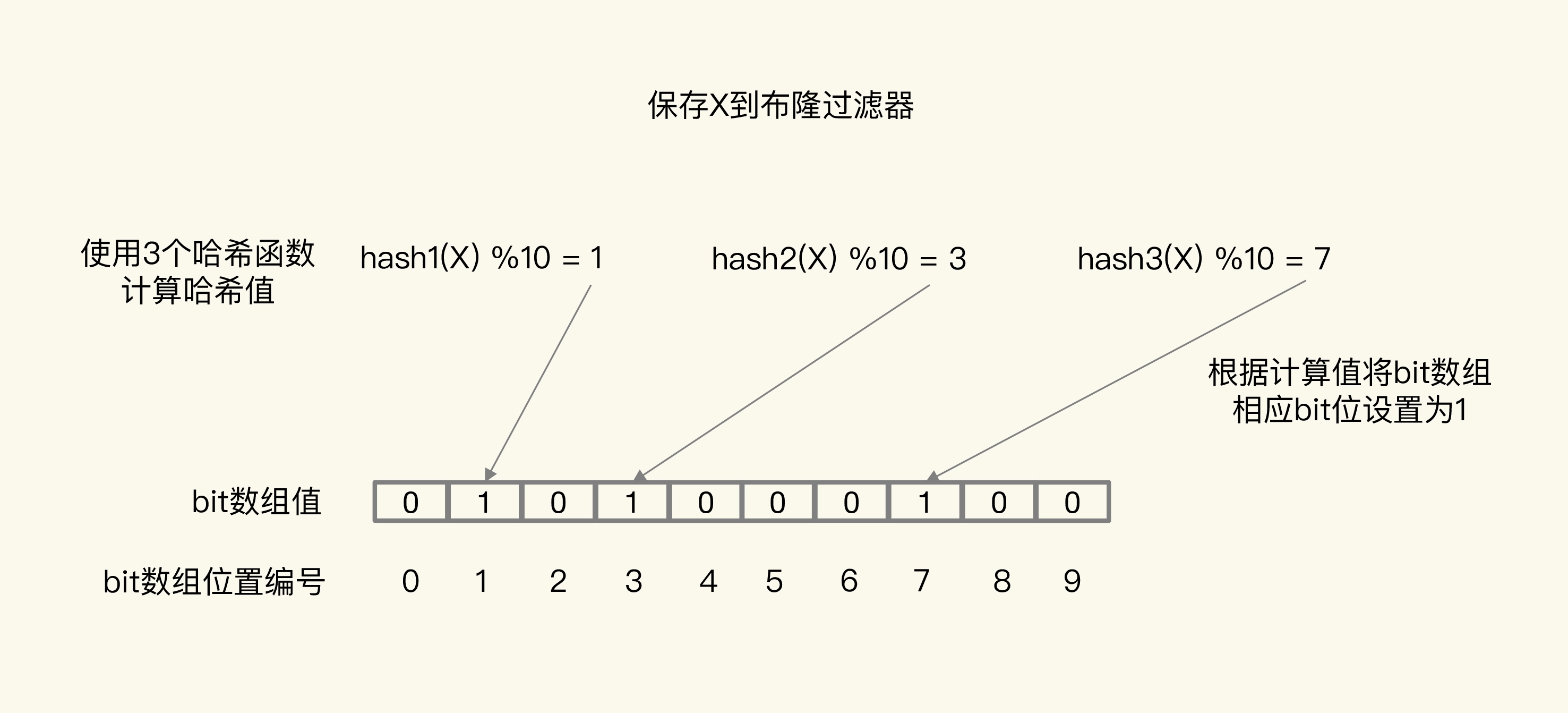 图中布隆过滤器是一个包含 10 个 bit 位的数组,使用了 3 个哈希函数,当在布隆过滤器中标记数据 X 时,X 会被计算 3 次哈希值,并对 10 取模,取模结果分别是 1、3、7。所以,bit 数组的第 1、3、7 位被设置为 1。当应用想要查询 X 时,只要查看数组的第 1、3、7 位是否为 1,只要有一个为 0,那么,X 就肯定不在数据库中。