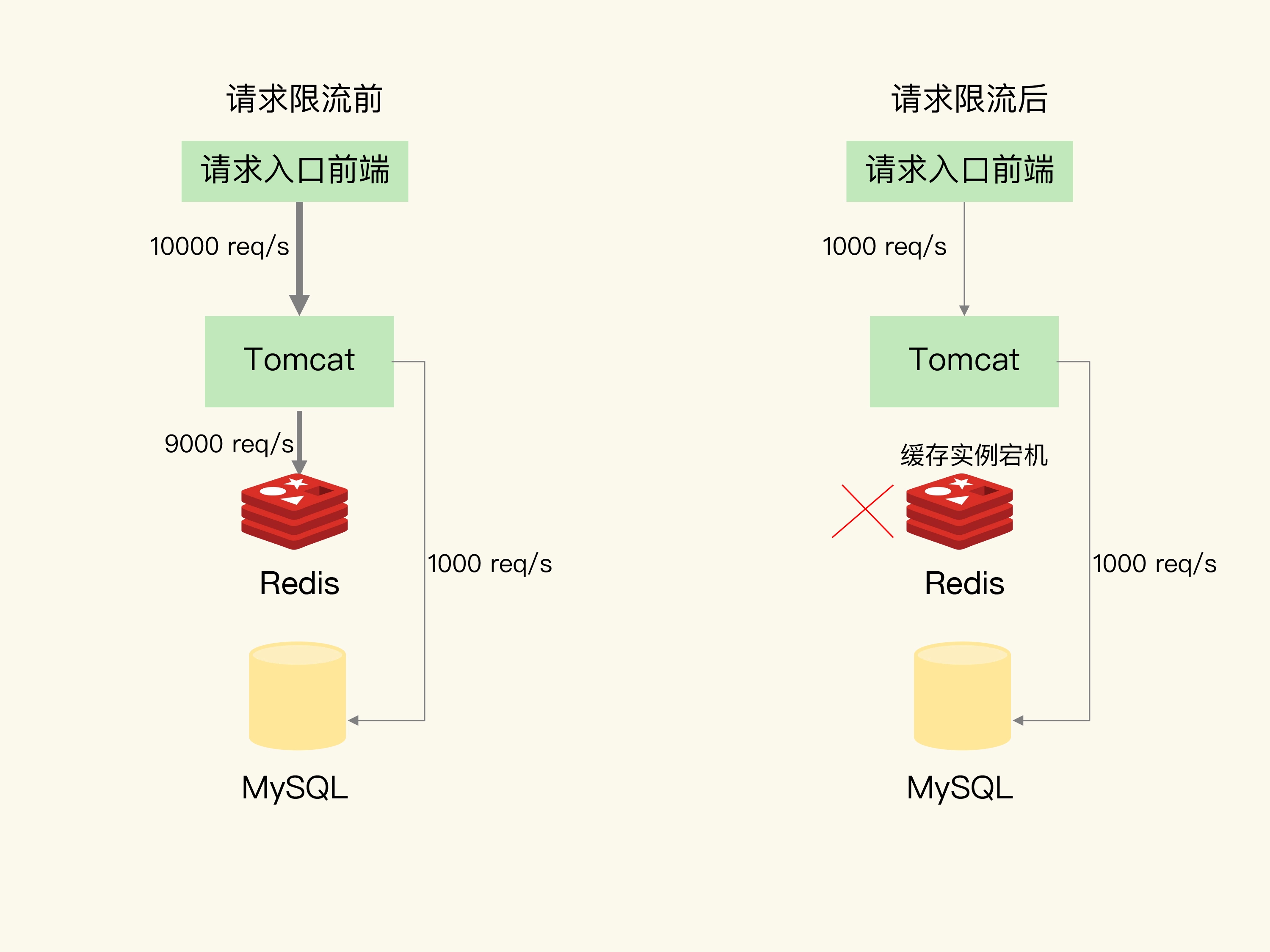 服务熔断虽然可以保证数据库的正常运行,但是暂停了整个缓存系统的访问,对业务应用的影响范围大。为了尽可能减少这种影响,我们也可以进行请求限流。这里说的请求限流,就是指,我们在业务系统的请求入口前端控制每秒进入系统的请求数,避免过多的请求被发送到数据库。