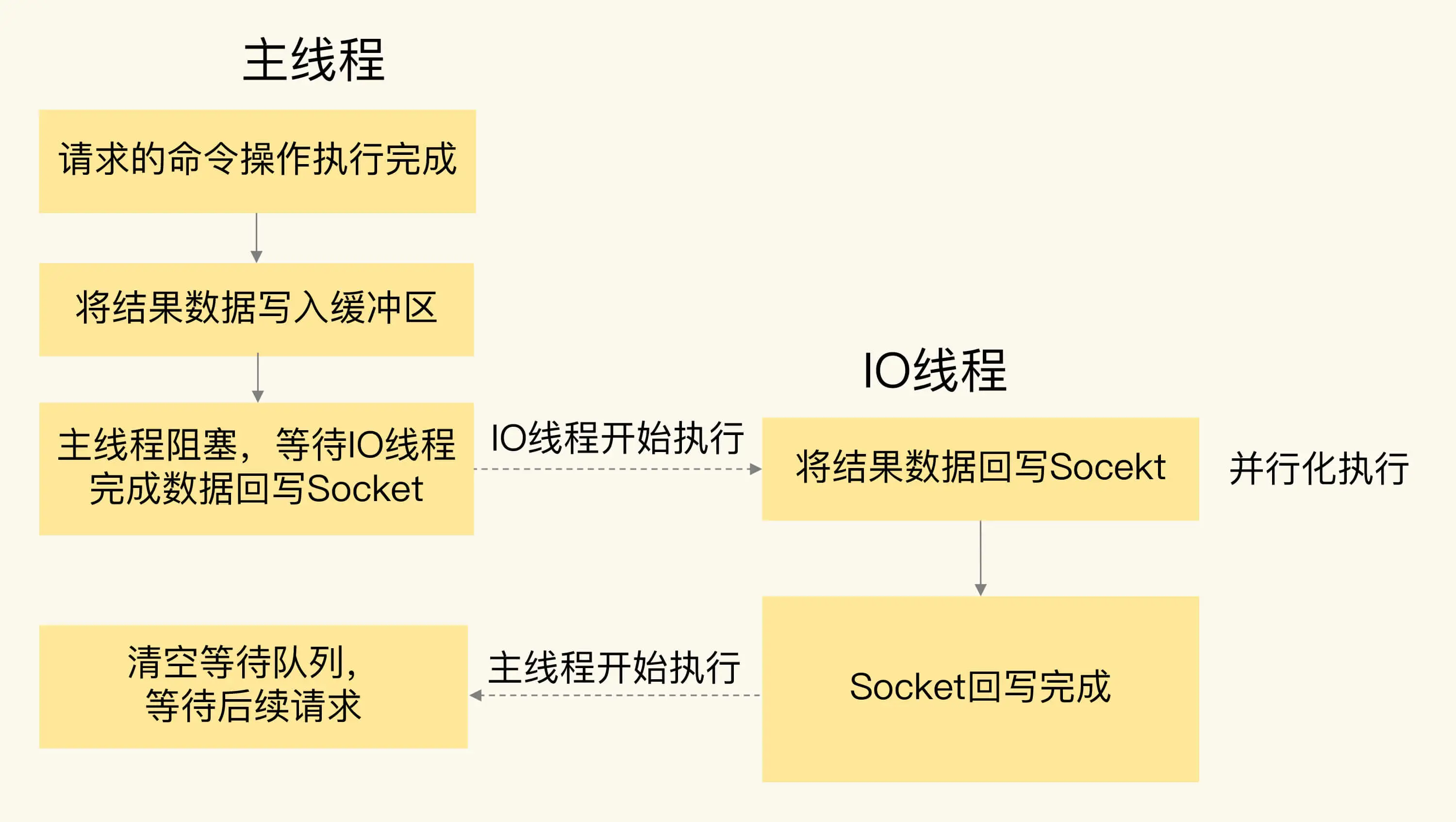 当主线程执行完请求操作后,会把需要返回的结果写入缓冲区,然后,主线程会阻塞等待 IO 线程把这些结果回写到 Socket 中,并返回给客户端。