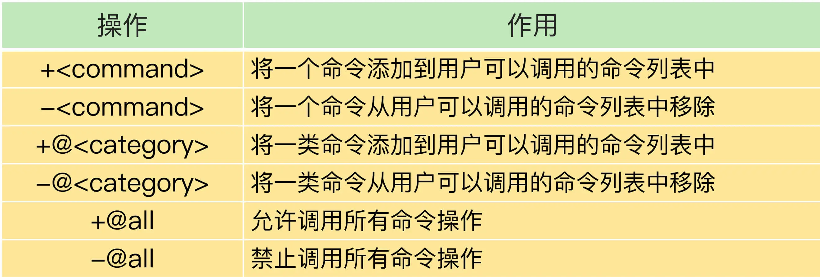 另外,6.0 版本还支持以用户为粒度设置命令操作的访问权限。我把具体操作列在了下表中,你可以看下,其中,加号(+)和减号(-)就分别表示给用户赋予或撤销命令的调用权限。