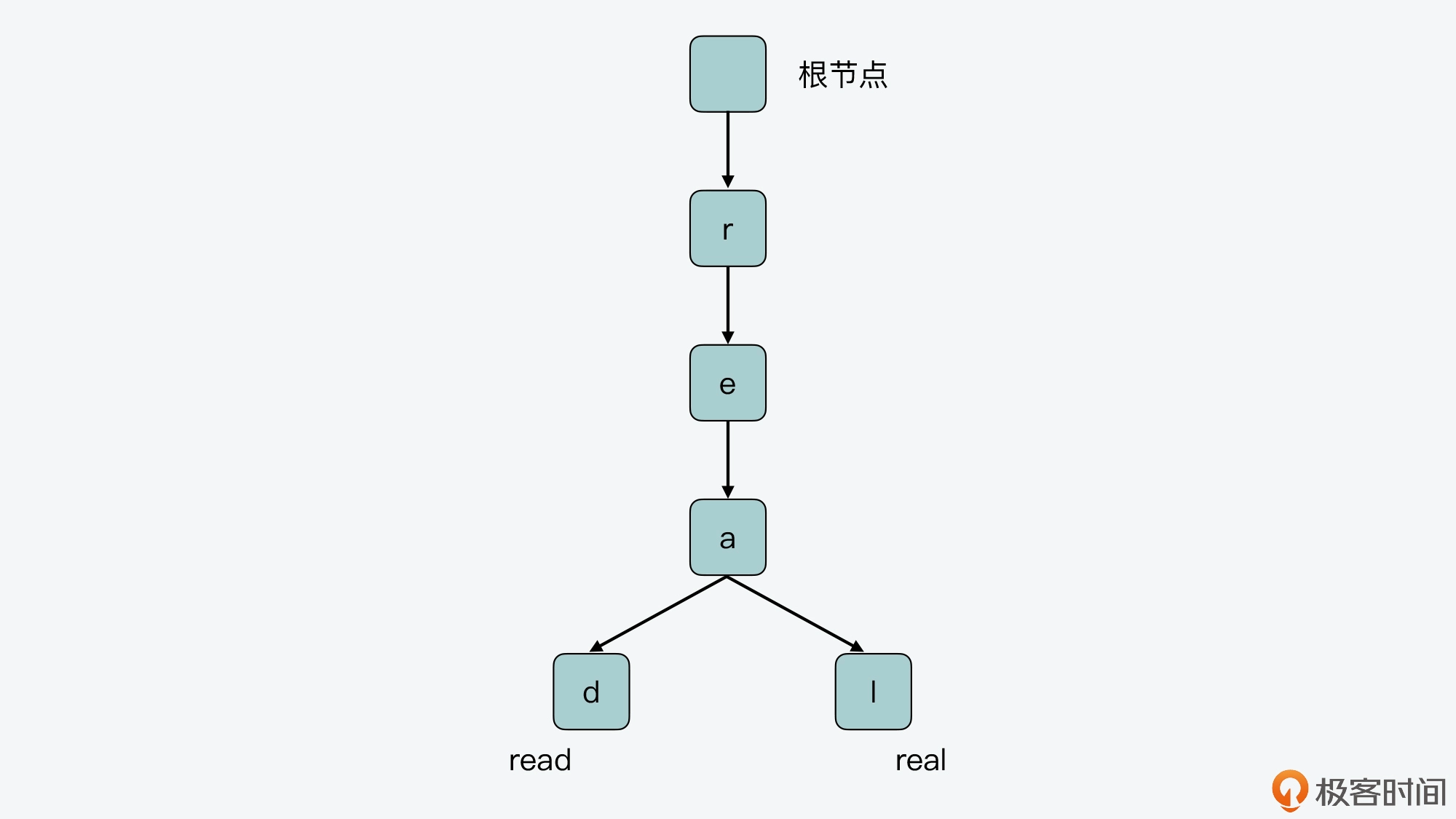 下面这张图展示了一个简单的前缀树,你可以看下。图中的前缀树有两个叶子节点,将根节点到这两个叶子节点的路径上,对应的字符拼接起来后,就得到了两个 key:read 和 real。