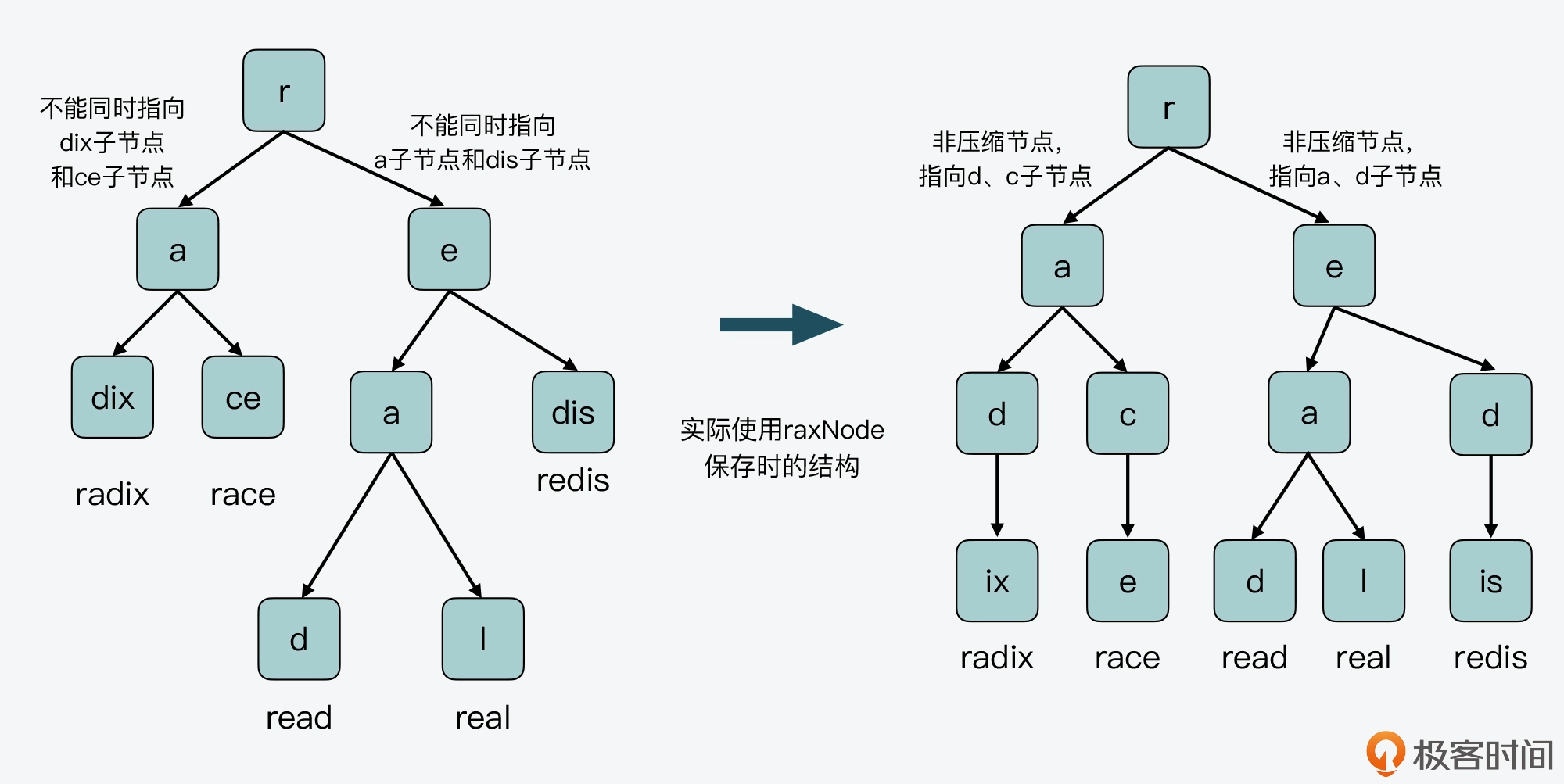 我给你举个例子,在下图的左半部分,节点 r 的子节点 a,它的两个子节点表示的都是合并字符串“dix”和“ce”。因此,节点 a 的 raxNode 结构,无法同时指向 dix 子节点和 ce 子节点。类似的,r 节点的子节点 e,它的两个子节点,一个表示的是单字符“a”,另一个表示的是合并字符串“dis”,节点 e 的 raxNode 结构也无法同时指向这两个子节点。