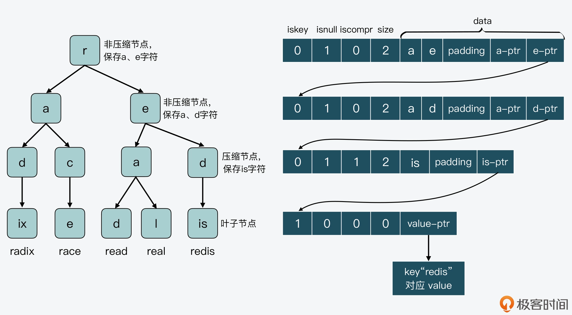 而这两个特点就给 Radix Tree 实际保存数据时的结构,带来了两个方面的变化。