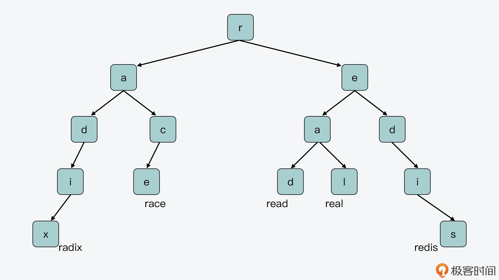 我来给你举个例子,假设有 5 个 key,分别是 radix、race、read、real 和 redis,它们在前缀树上的布局如下图所示。