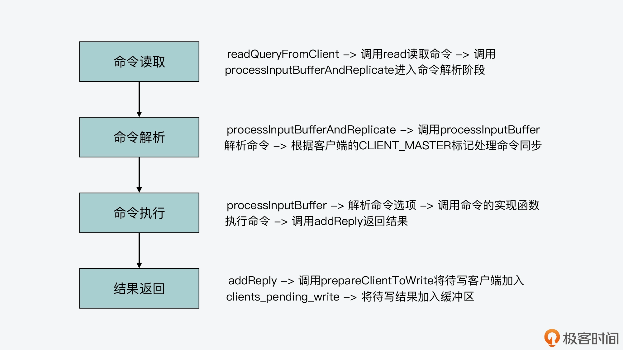 紧接着,我还带你具体剖析了下 Redis 中命令处理的整个过程。我把这个过程分成了四个阶段,分别是命令读取、命令解析、命令执行和结果返回。所以,你还需要了解这四个阶段中所执行函数的主要流程。