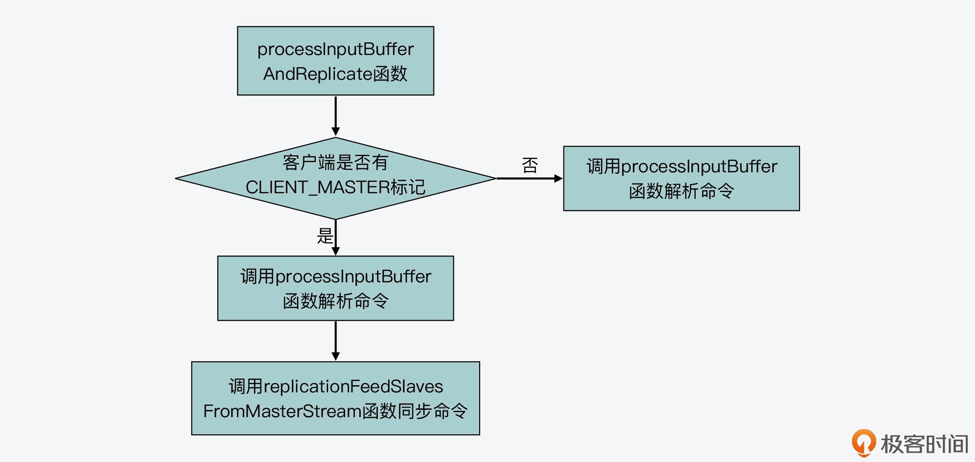 processInputBufferAndReplicate 函数(在networking.c文件中)会根据当前客户端是否有 CLIENT_MASTER 标记,来执行两个分支。
